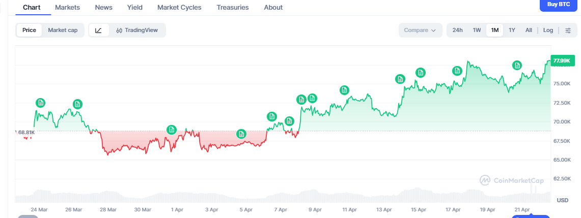 Currently, the last two weeks have been good for the Bitcoin price and the current price for the Bitcoin is 77,000 roughly which I think can touch 80,000 also if it continues to move like this so in next few days we can see it going there but again looking at the global narratives things are not looking so good at the moment.