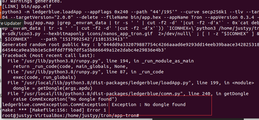 "No dongle found" means that you need to plugin the Ledger Wallet.
