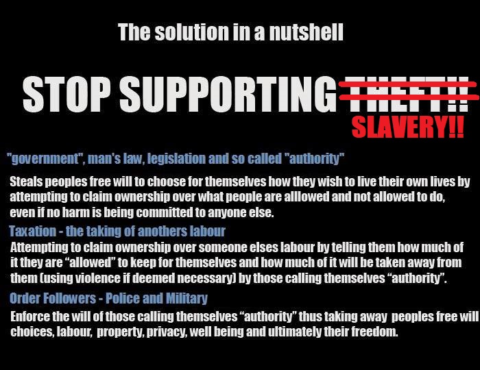 Abandon the ONE thing keeping humanity enslaved and held tightly in our current state of tyranny, the beLIEf in "authority" aka statism/government.
