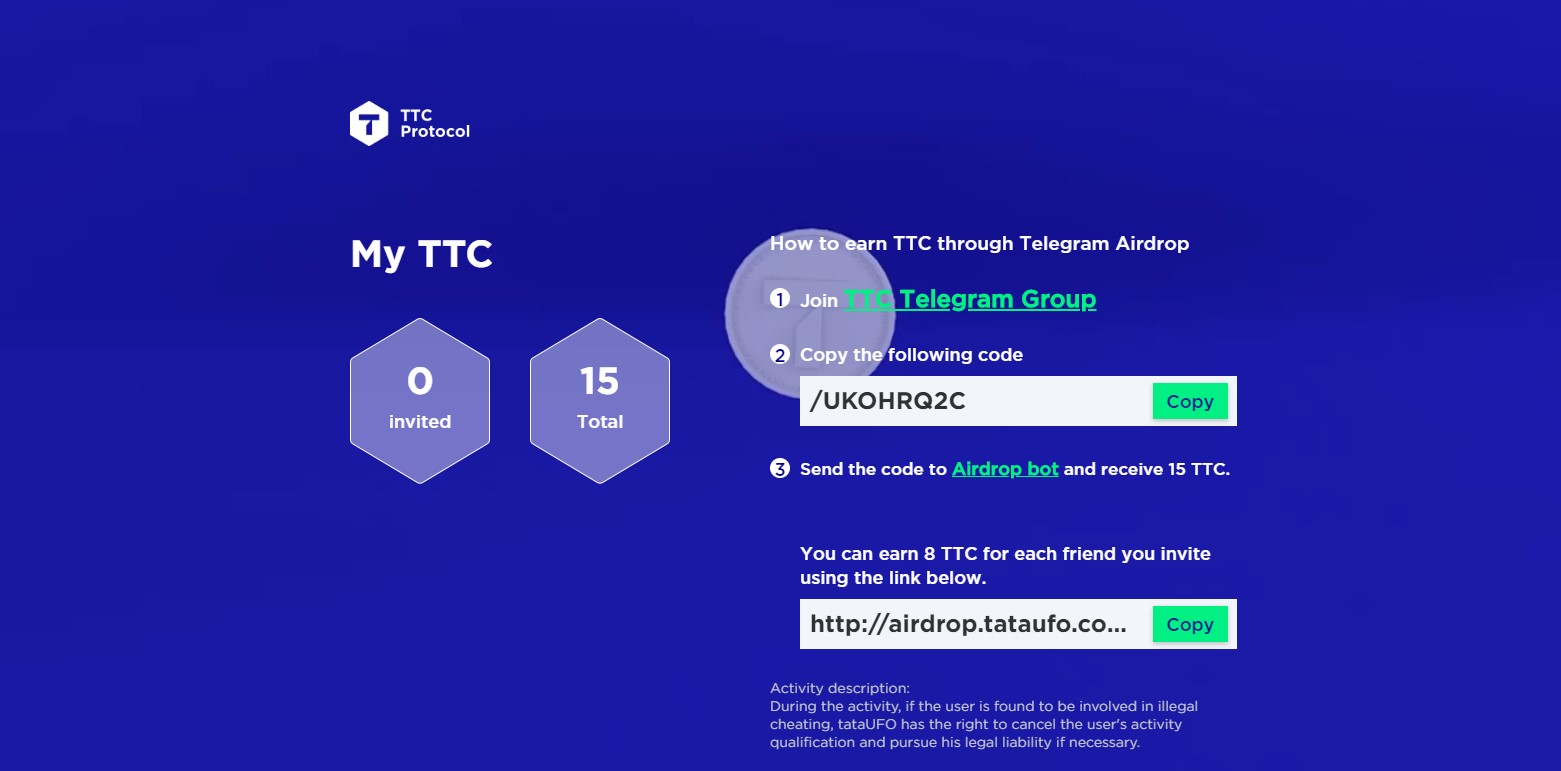- Copy the referral link and share it with your friends. For every successful referral, you will receive 8 TTC tokens and your friend will receive 15 TTC tokens.