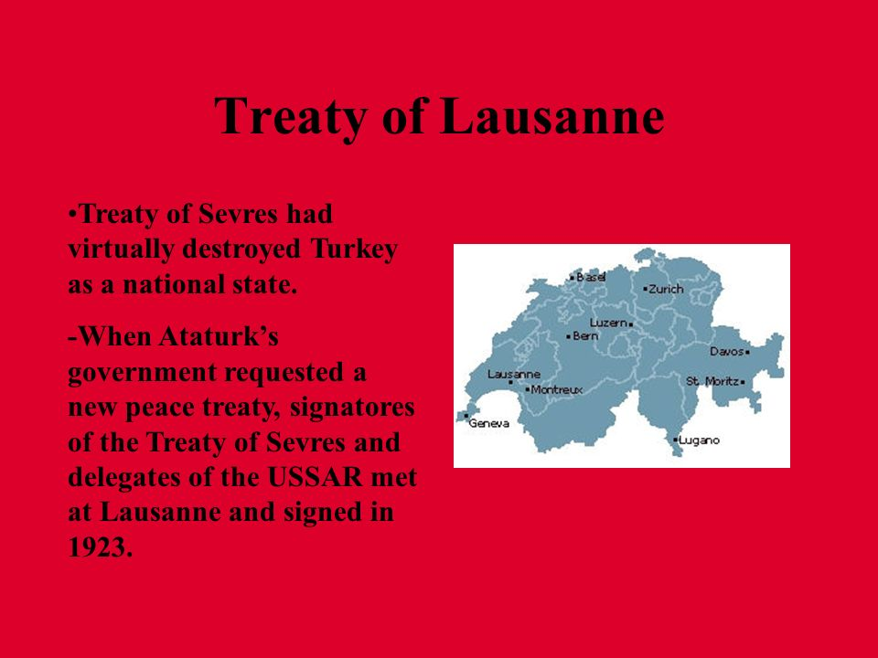 After the Treaty of Lausanne was signed, Turkey became a sovereign state and began the process of building its modern nation-state. This included the development of new political, economic, and social institutions, as well as the construction of infrastructure and the establishment of diplomatic relations with other countries.