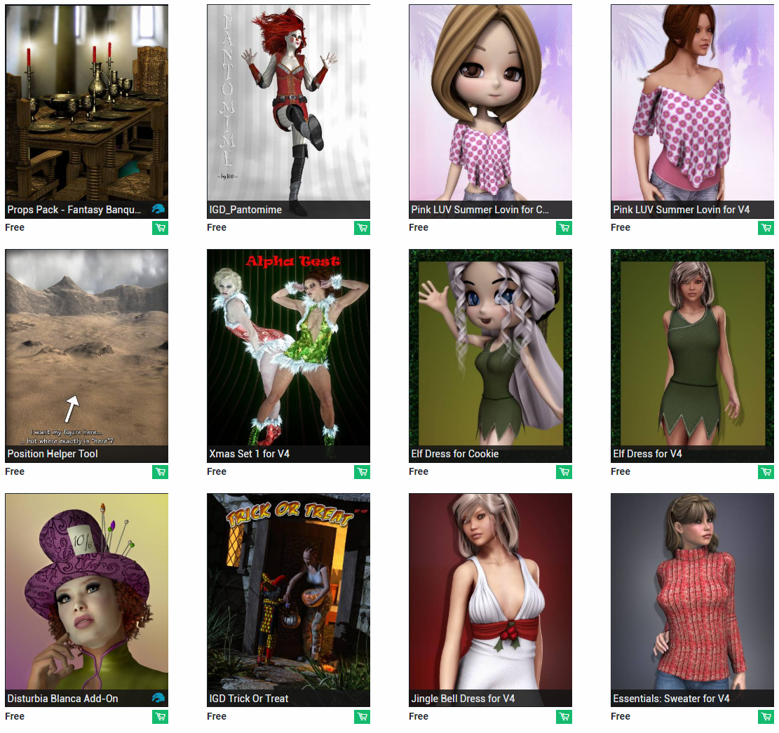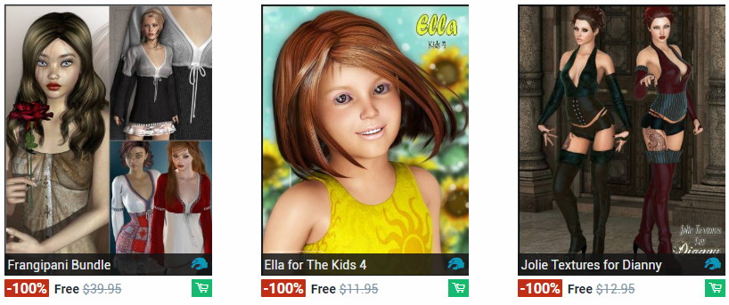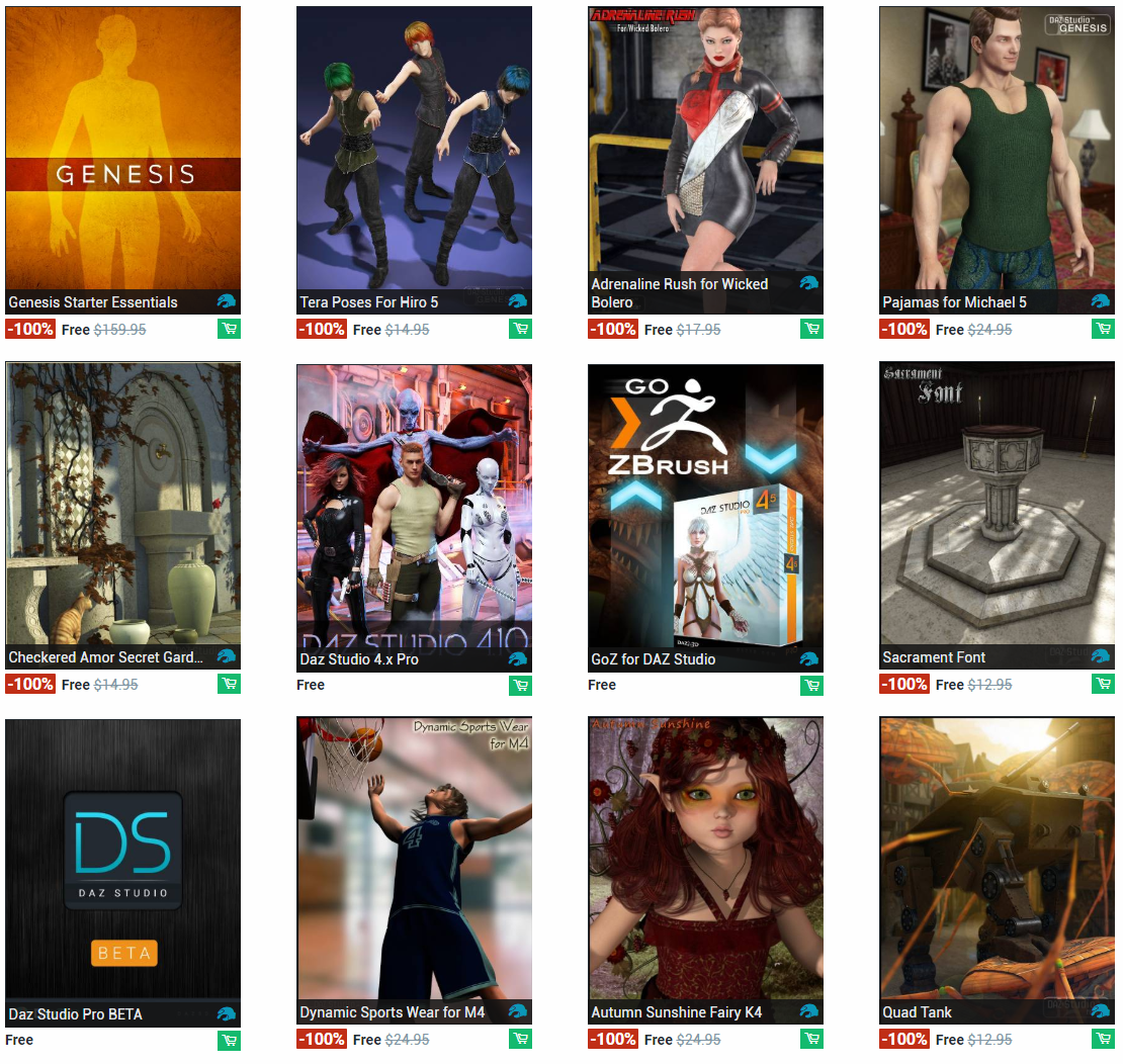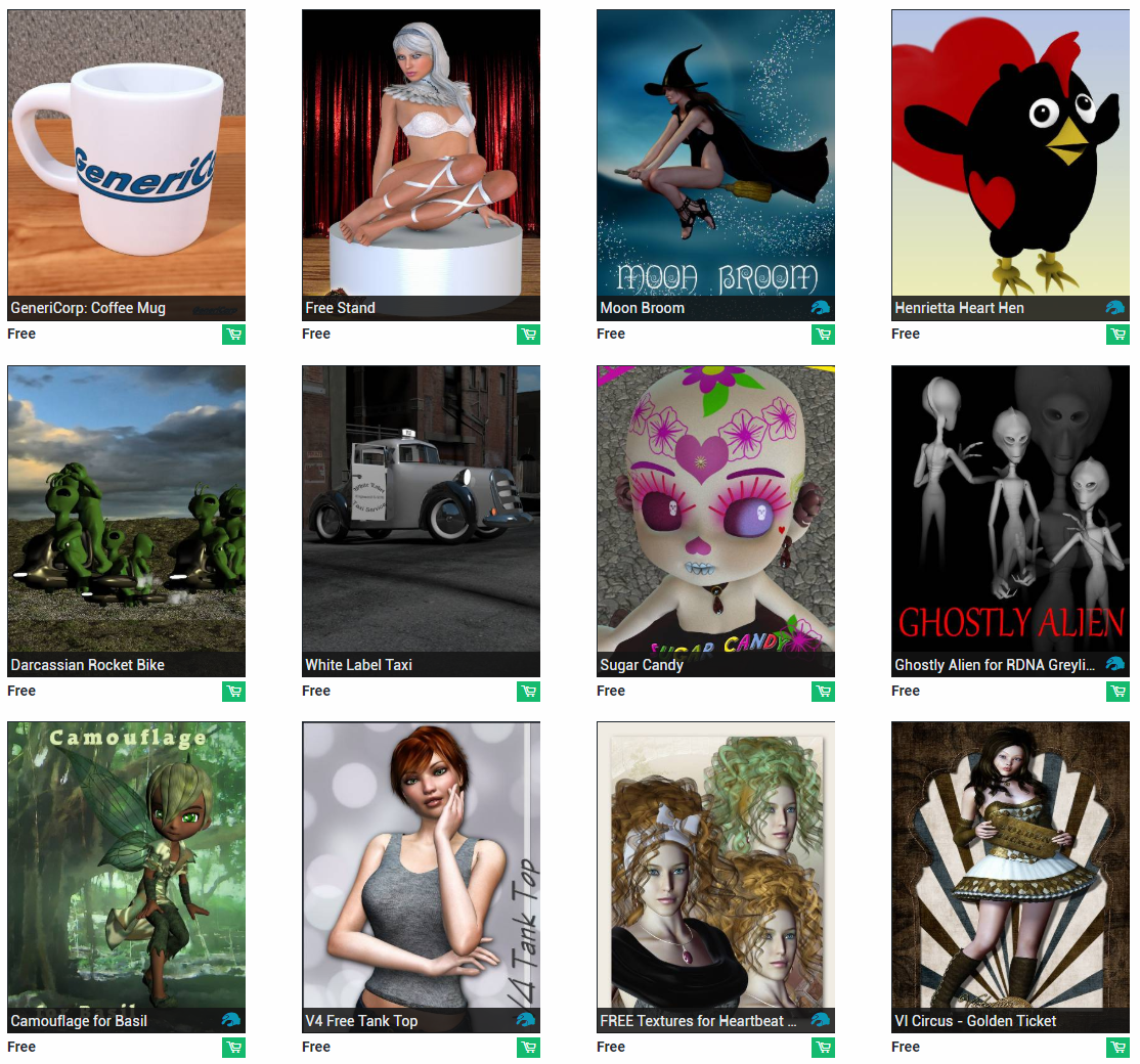 Free items are released each week on www.daz3d.com. It makes it worth checking a couple times during the week to see what products you can get. I've noticed that these are often texture packs for outfits so you can't really use them without the outfit that they go with, but this is not the only case. They also like giving out scenes, furniture, and props as free items. You can end up with characters/figures, clothing, hair, and more.
