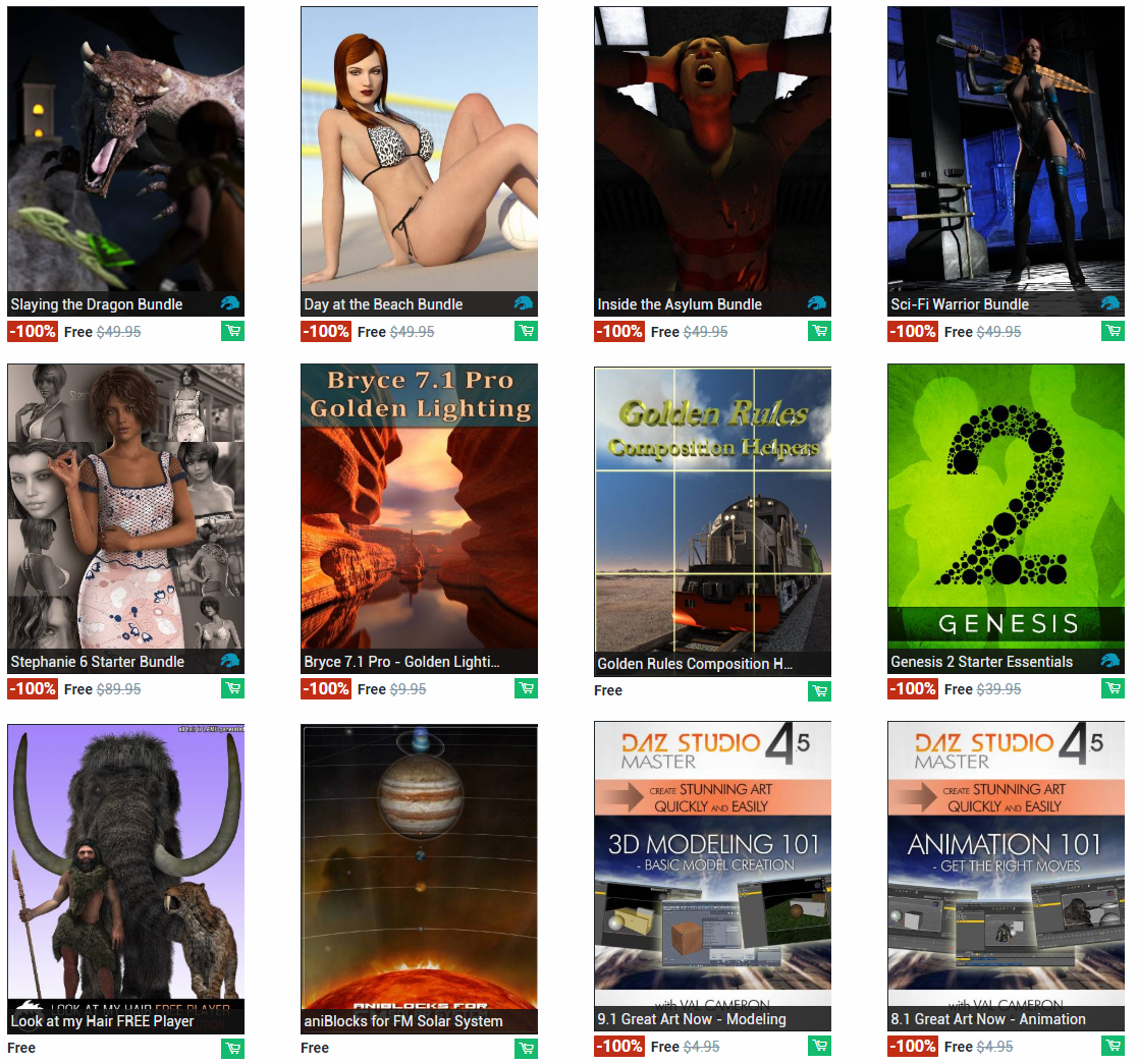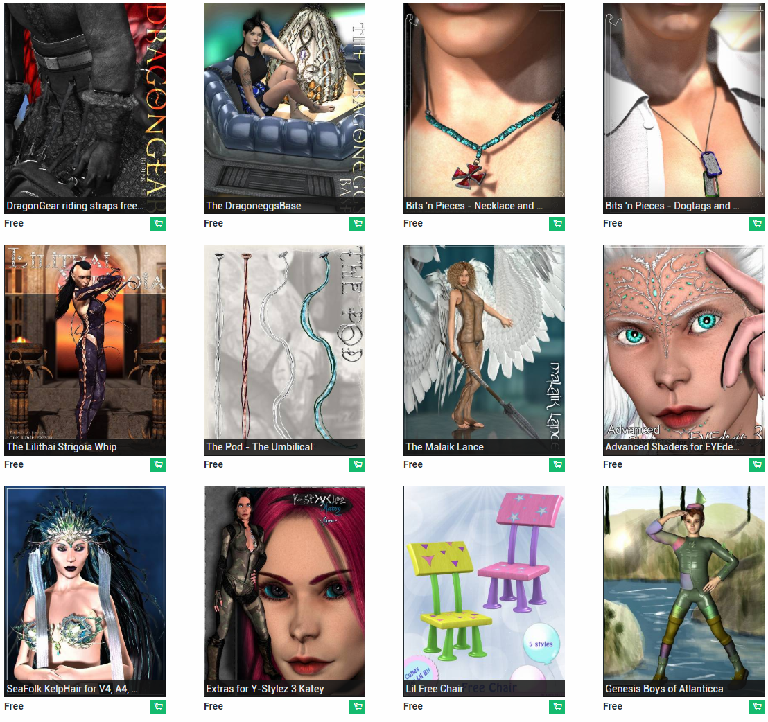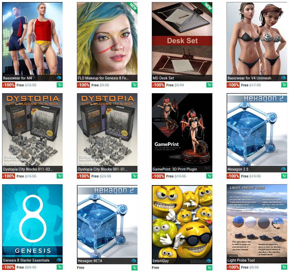Free items are released each week on www.daz3d.com. It makes it worth checking a couple times during the week to see what products you can get. I've noticed that these are often texture packs for outfits so you can't really use them without the outfit that they go with, but this is not the only case. They also like giving out scenes, furniture, and props as free items. You can end up with characters/figures, clothing, hair, and more.