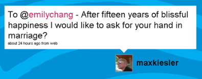 On 28 May 2018, Max Kiesler proposed to marry Emily Chang on Twitter.