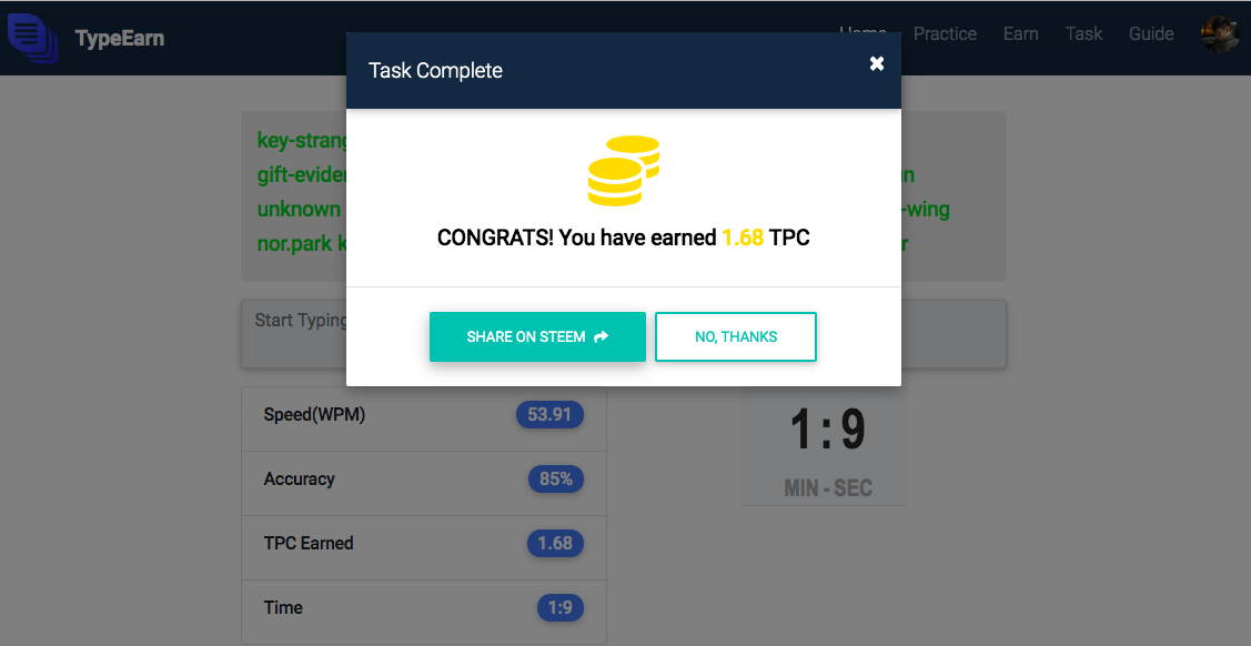 Congrats ! You can also earn TPC tokens after finishing typing test.