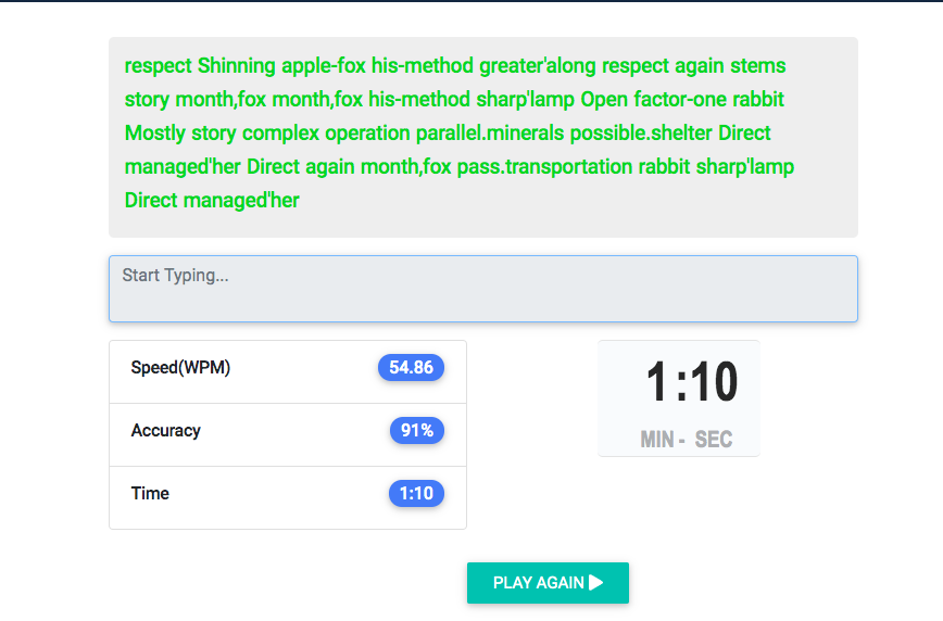 The same as other typing training websites, you need to type the words provided above, trying your best as fast as possible, after you finish typing all the words, TypeEarn will show you the Speed and the time you spent each time.