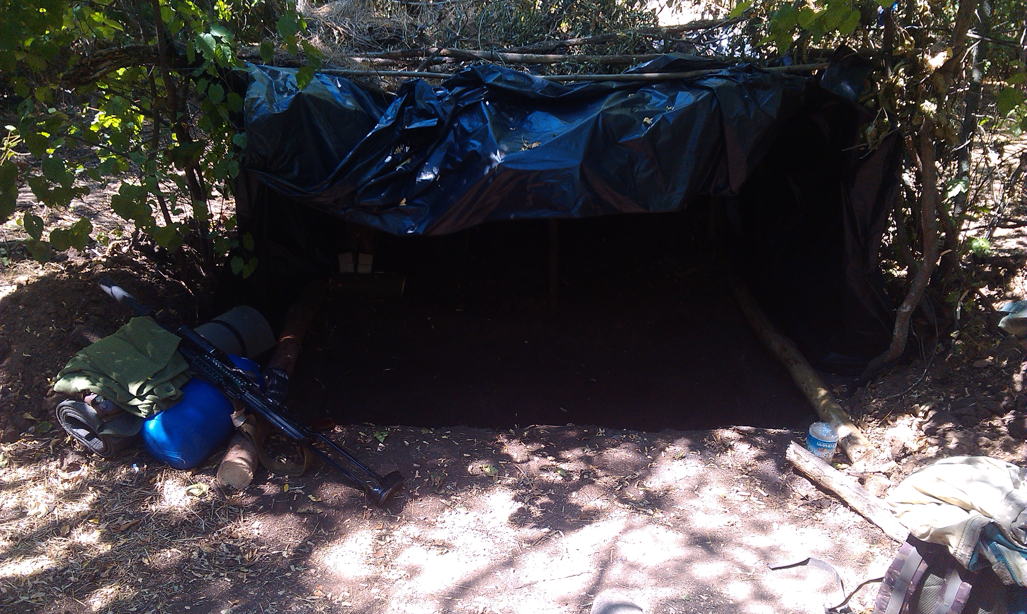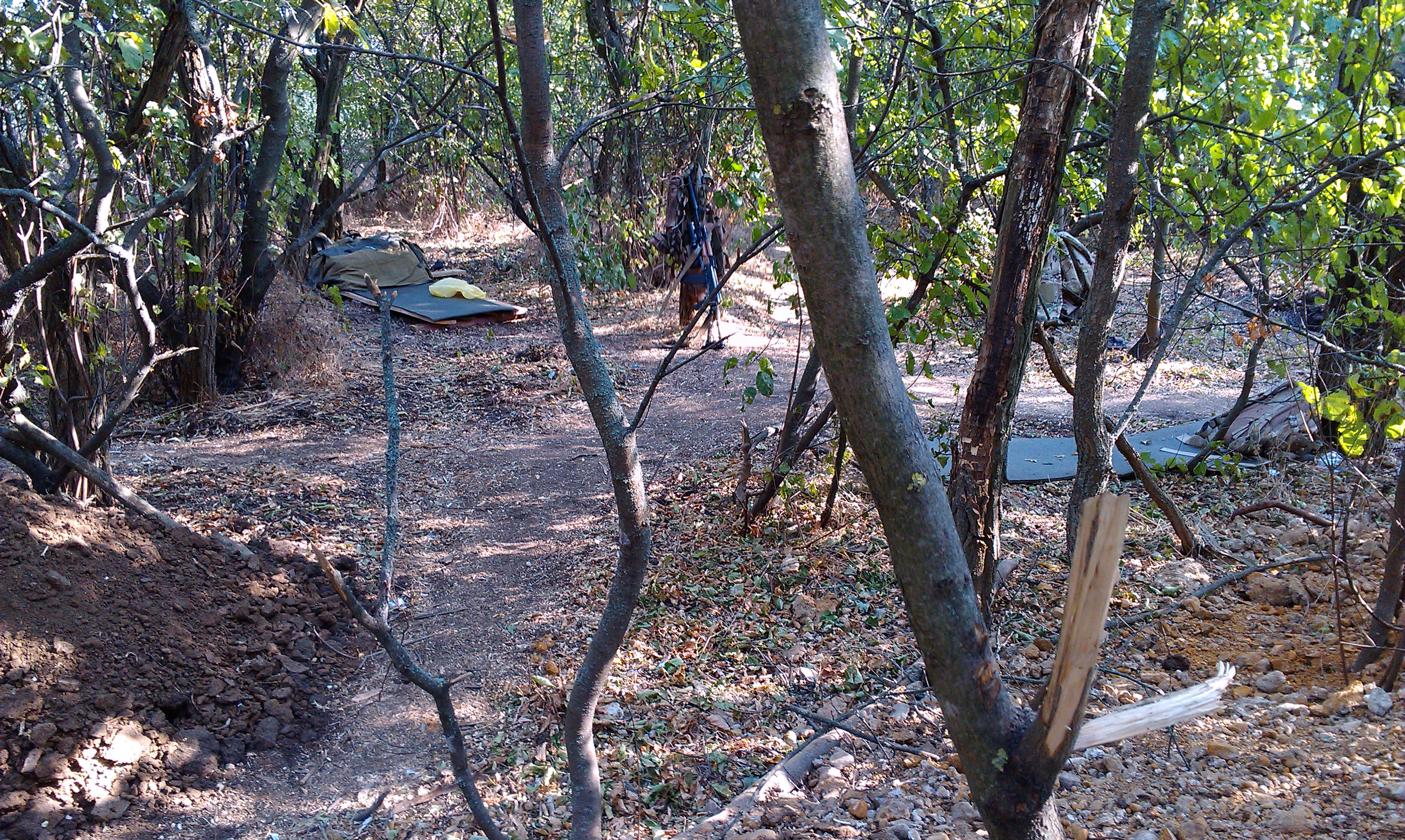 Наша СП расположилась в лесу на вершине холма.До ближайших наших укреплений было километра полтора.Меня не было в тот момент когда группа заходила в лес я прибыл туда только через две недели.Тогда меня не было на позициях я еще возился с документами в военкомате.Но там не было ничего особенного,только сняли одну растяжку,насколько я помню.Просто наша группа заняла "нейтральную территорию"-кусок леса неподконтрольный врагу,так называемая "серая зона".В непосредственной близости к врагу первоочередная задача это окопаться и максимально быстро замаскировать СП,чтобы нас не засекли БПЛА противника.Мои предшественники начали окапываться и вырыли три ямы полтора метра глубиной,метр шириной и два метра в длинну.Для того что бы можно было спать и не бояться внезапного обстрела.Позже мы углубились и еще больше замаскировали наш пост.Задача это довольно трудная,земля которая была там это смесь глины и чернозема которая при высокой температуре просто превратилась в камень,нужно было киркой долбить это месиво,закапываясь при этом всего лишь на несколько сантиметров,а потом выкидывать землю на поверхность.Все происходило летом и температура была около 35 градусов.Не забывайте при этом что вы в камуфляжных штанах и ботинках,бронижилеты все сняли и остались просто в футболках или раздевшись полностью,работали с голым торсом.Снять бронежилет плохая идея и нарушение техники безопасности,но я не знаю людей которые смогут в полном обмундировании в жару,долбить киркой каменную землю на протяжении многих часов,а потом еще и заступить на пост.Но все же мы немного окопались и можно было начать маскироваться.Яма возле которой я спал была накрыта куском черной клеенки.Она хорошо защищала меня от солнца,а потом и от дождя.На крышу моего жилища я набросал много веток и листьев,также спрятал все веши под клеенку.На краю ямы я расстелил каремат,а из кофты и куртки сделал подушку.На ночь я расстилал спальник и получалось довольно комфортно.С другой стороны ямы под навесом я поставил рюкзак и боезапас,а также всю электронику,телефон,павербанк для зарядки телефона и т.д.Автомат всегда был под рукой.Ну или почти всегда.Как бы это киношно не звучало приходилось спать в обнимку с автоматом.Попутно начали строить блиндаж.Вот собственно и все на сегодня.как показывает практика при наличии желания человек может жить где угодно.