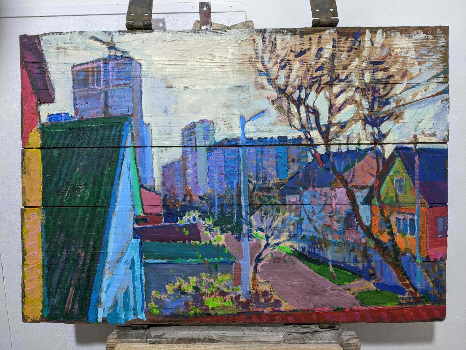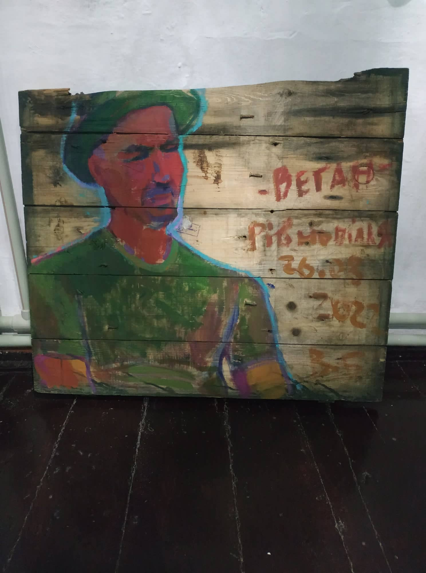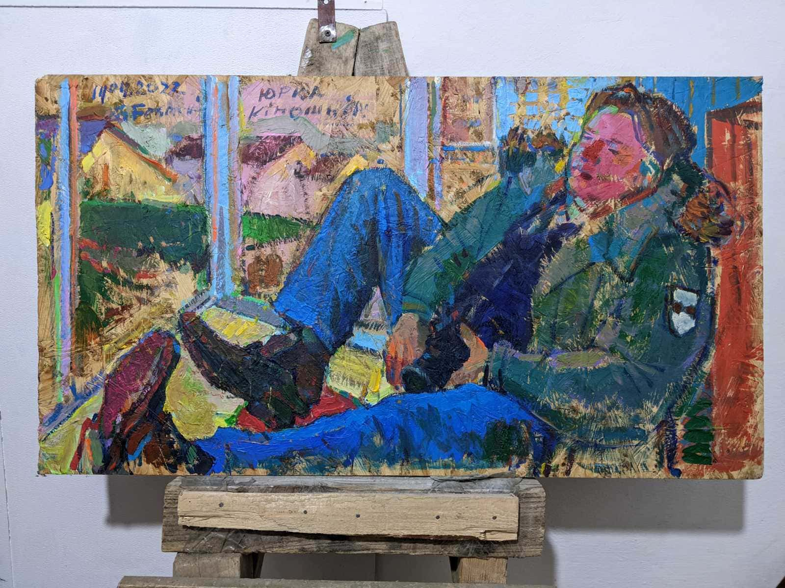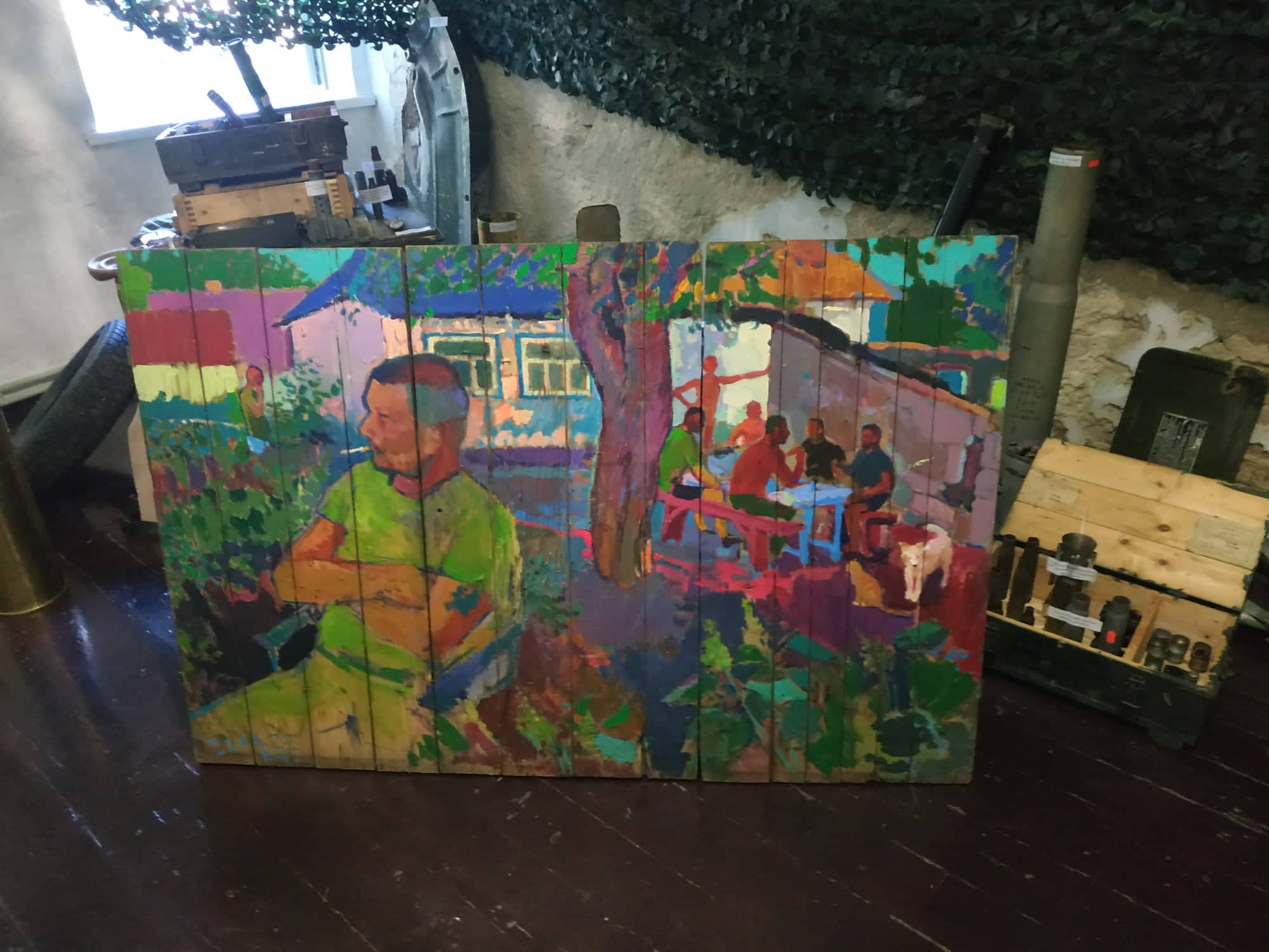 Мова йде про Володимира Безрукого. Його творчість нерозривно пов’язана з війною. Він малює війну, учасників бойових дій, побратимів, поранених. Він малює те, що бачить і на тому, на чому є. Найчастіше це дошки від ящиків з-під боєприпасів.