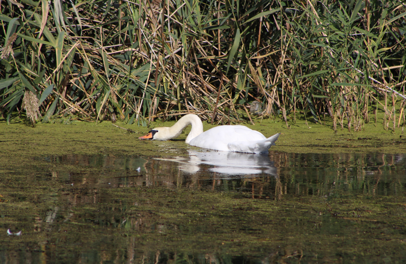 Отже перейшов я на саму переплаву, лебідь саме доплив у закуток, там де ряска і щось там вишукував. А я ж його в цей час ловив на камеру.