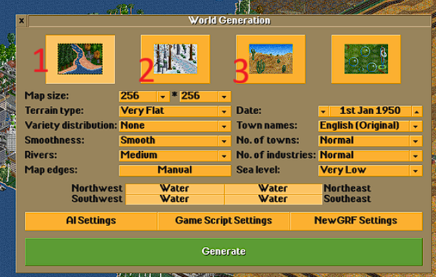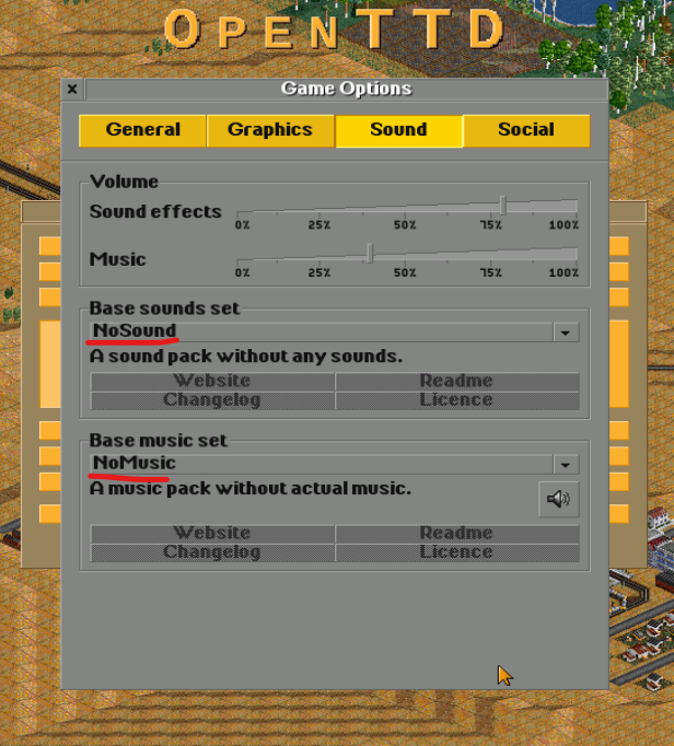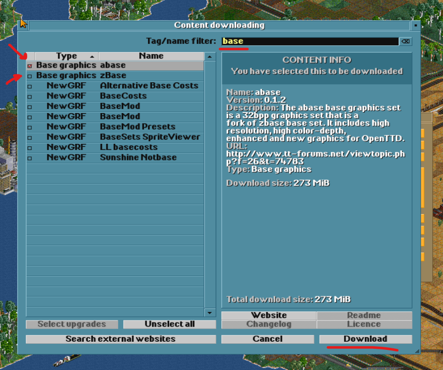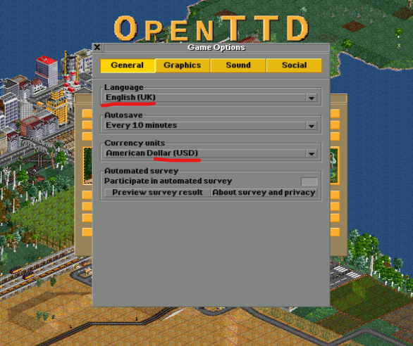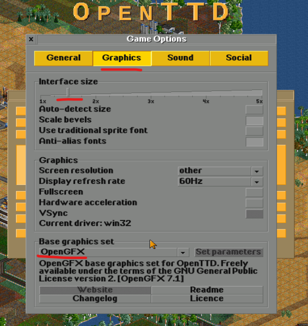 Depending on your monitor size, choose a multiplier for the font size. Also, select the Base graphics set — currently, it’s set to OpenGFX, but the graphic packages you downloaded in the previous step will also be available.