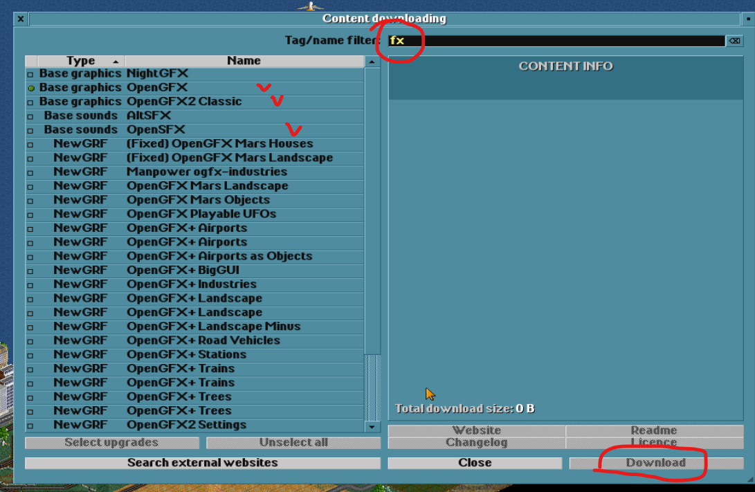 Using the search term “fx”, download the basic graphics and basic sounds.