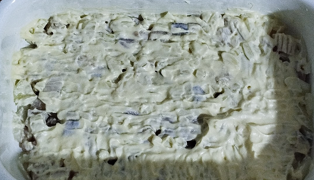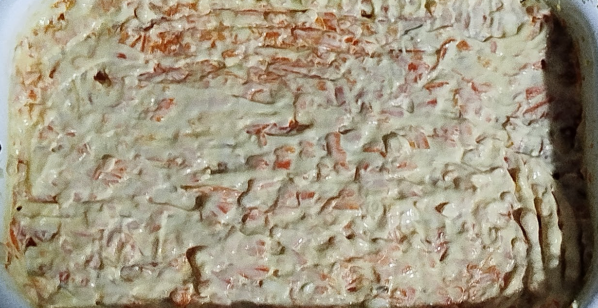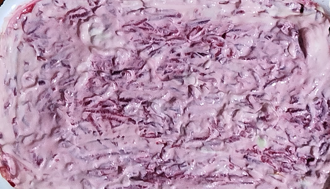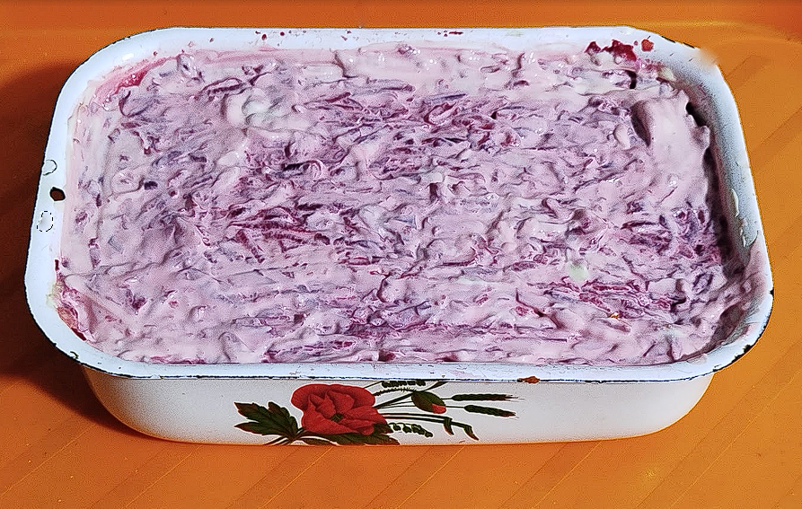 Але салат ще не готовий, він має простояти деякий час в холодильнику щоб майонез просочився крізь шари.