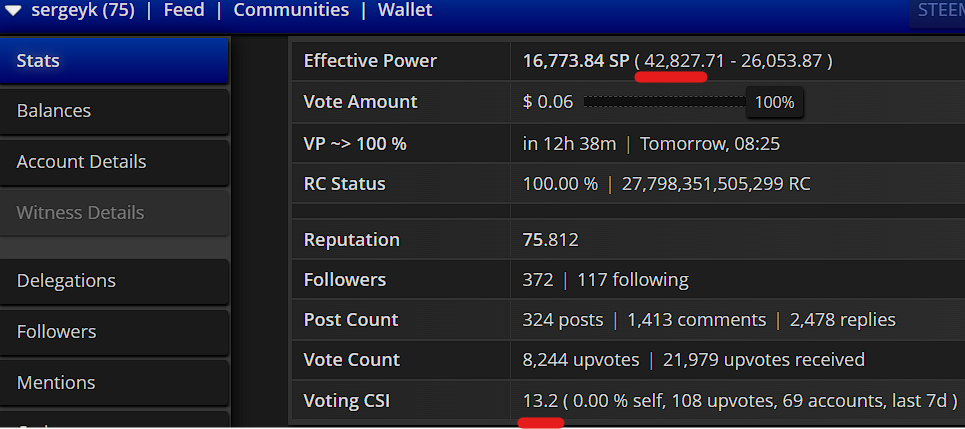| User name:@sergeyk Country:Ukraine STEEM Power: 42883 STEEM CSI: 13.2 Club status: constantly #club100 Powered up: 2265 STEEM Cashed Out: 0 STEEM Reputation :75.8 | ![]() | |