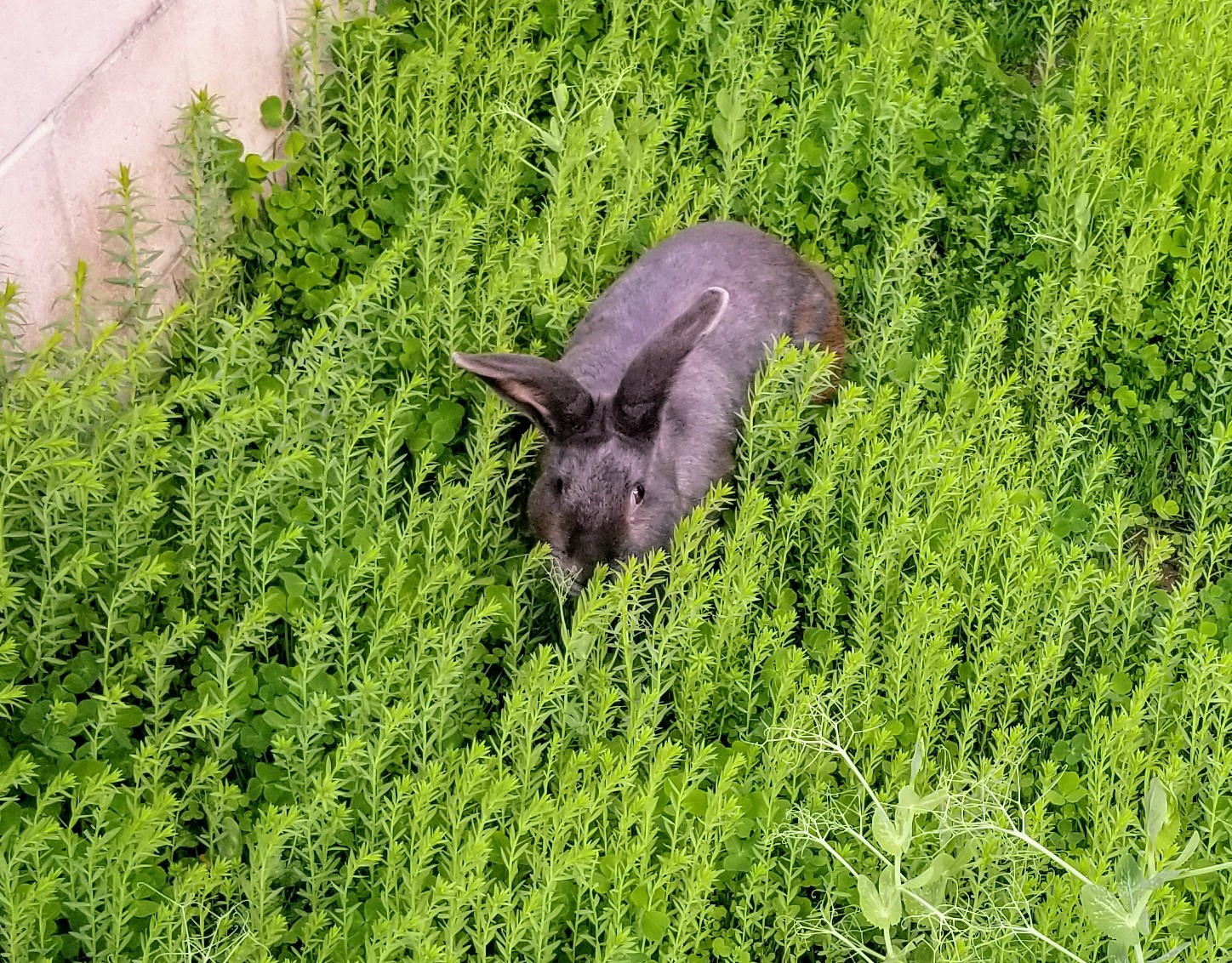 Today I tested our tiny "Southwest Poultry + Timothy Pasture Blend" on Devon, our Blue American buck. He is a very mellow bunny, whose breed profile describes him to a T when it says that bucks are so mild, they border on lazy. I knew Devon was a safe bet on being easy to catch without stomping all over the tender new plants.