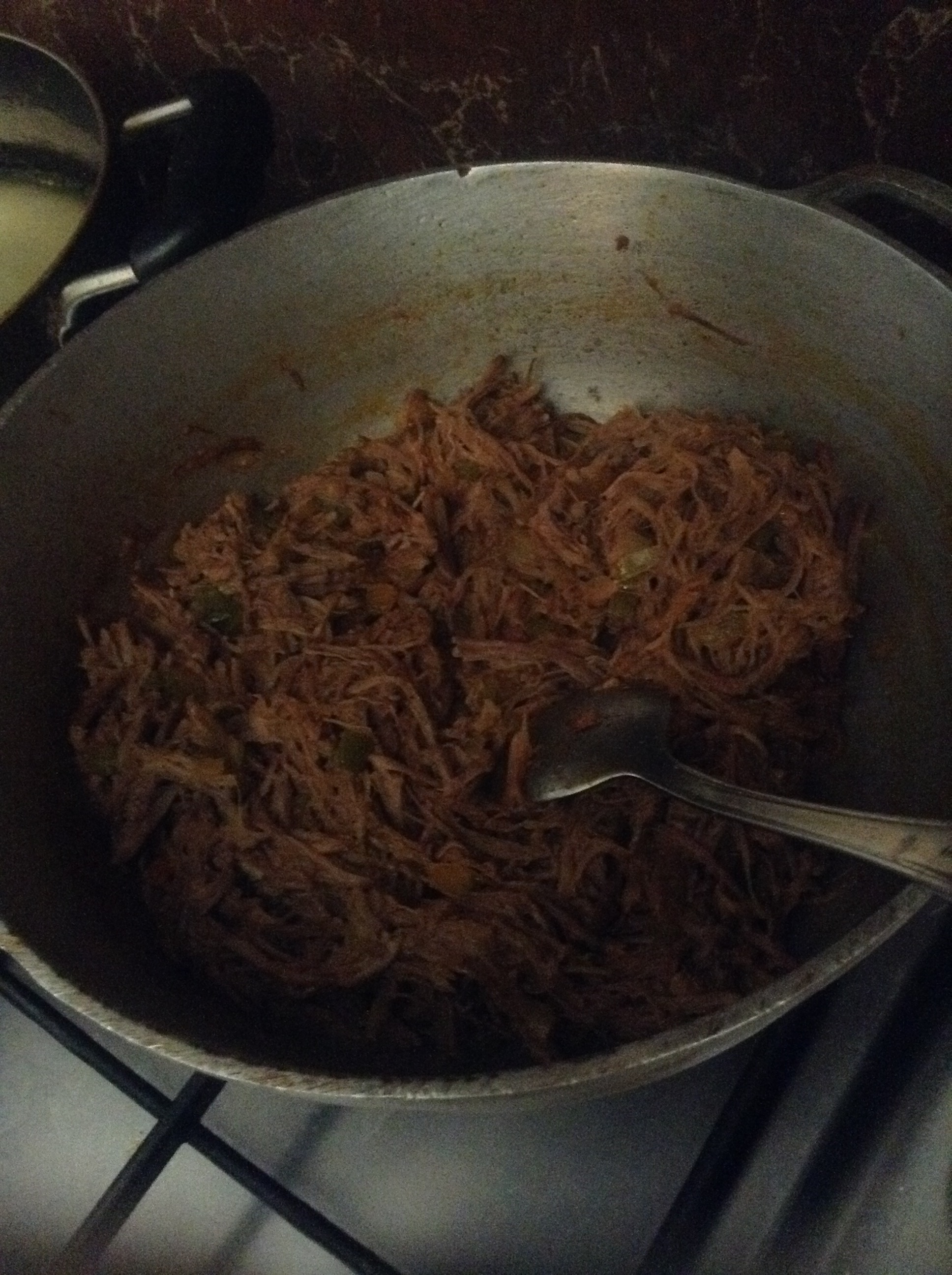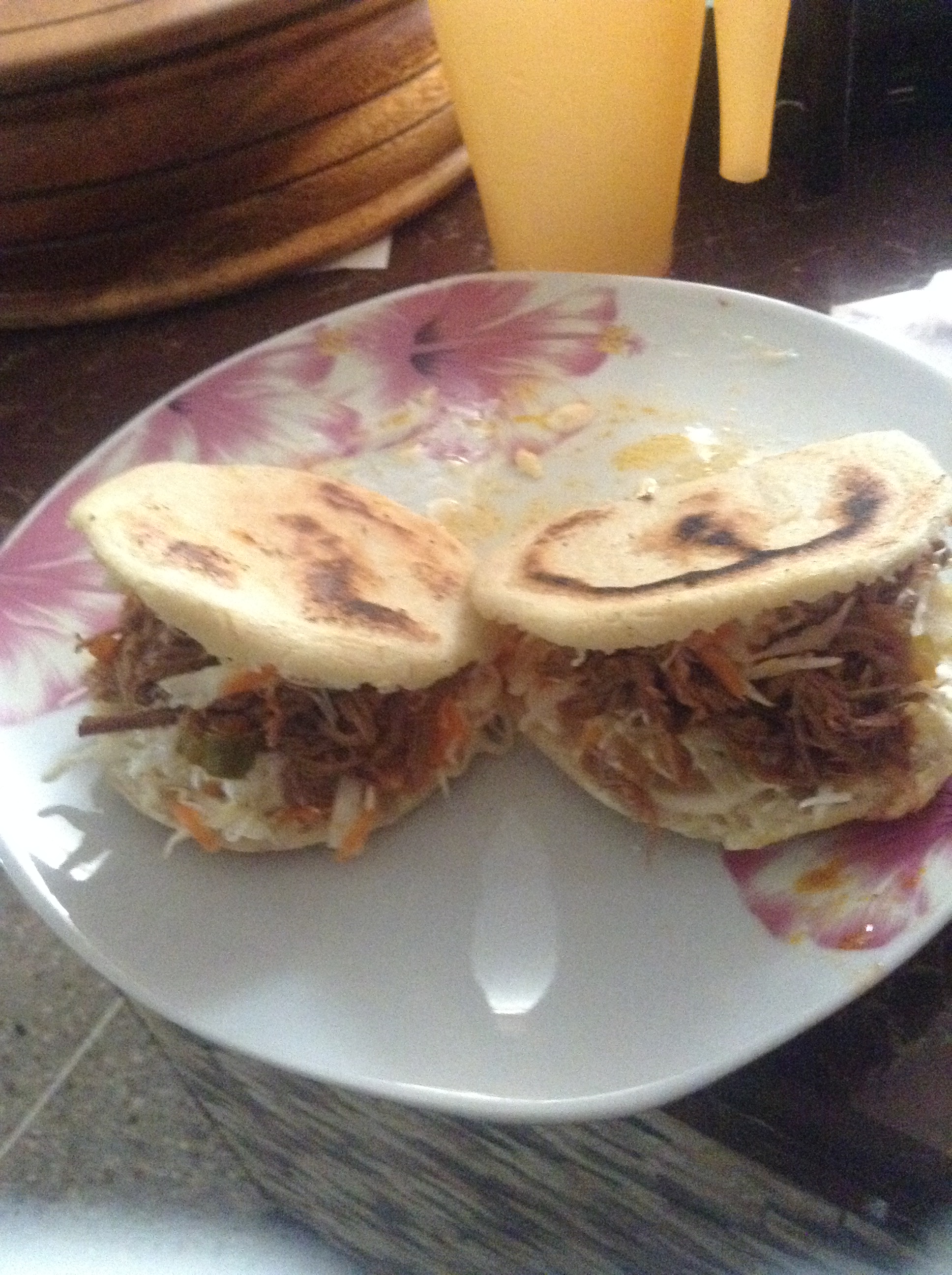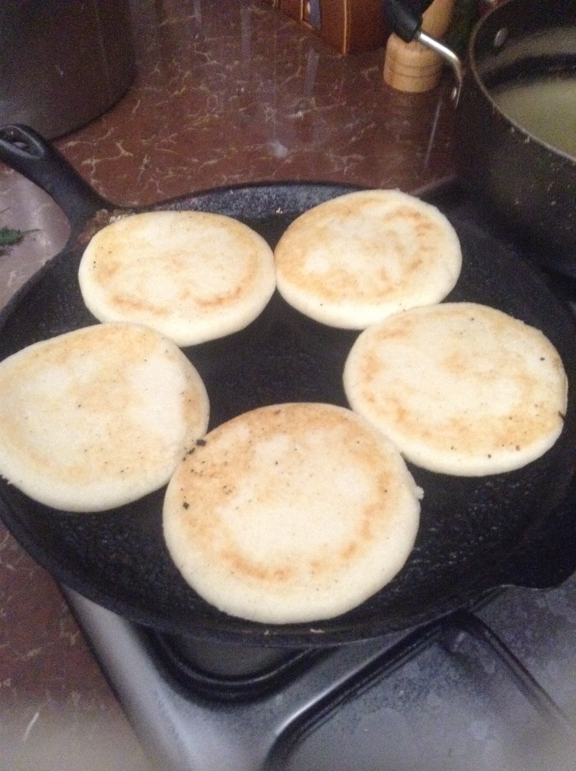 I'm not very good at making arepas so my mom made them, cornmeal, water and salt. Then to the frying pan to cook them until they are crispy.