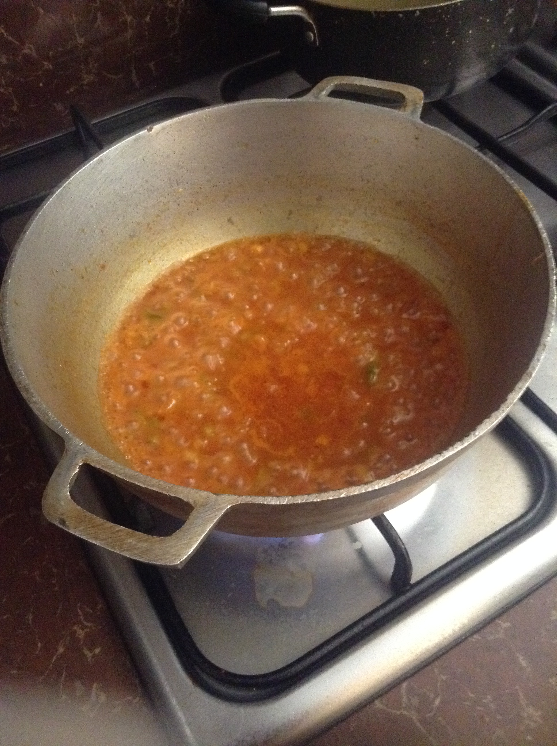 Here in a frying pan add soybean oil only just a little, green pepper cut into small pieces, onion and cut in the same way, crushed garlic, paprika and obviously salt and pepper. It's some kind of fried sauce.
