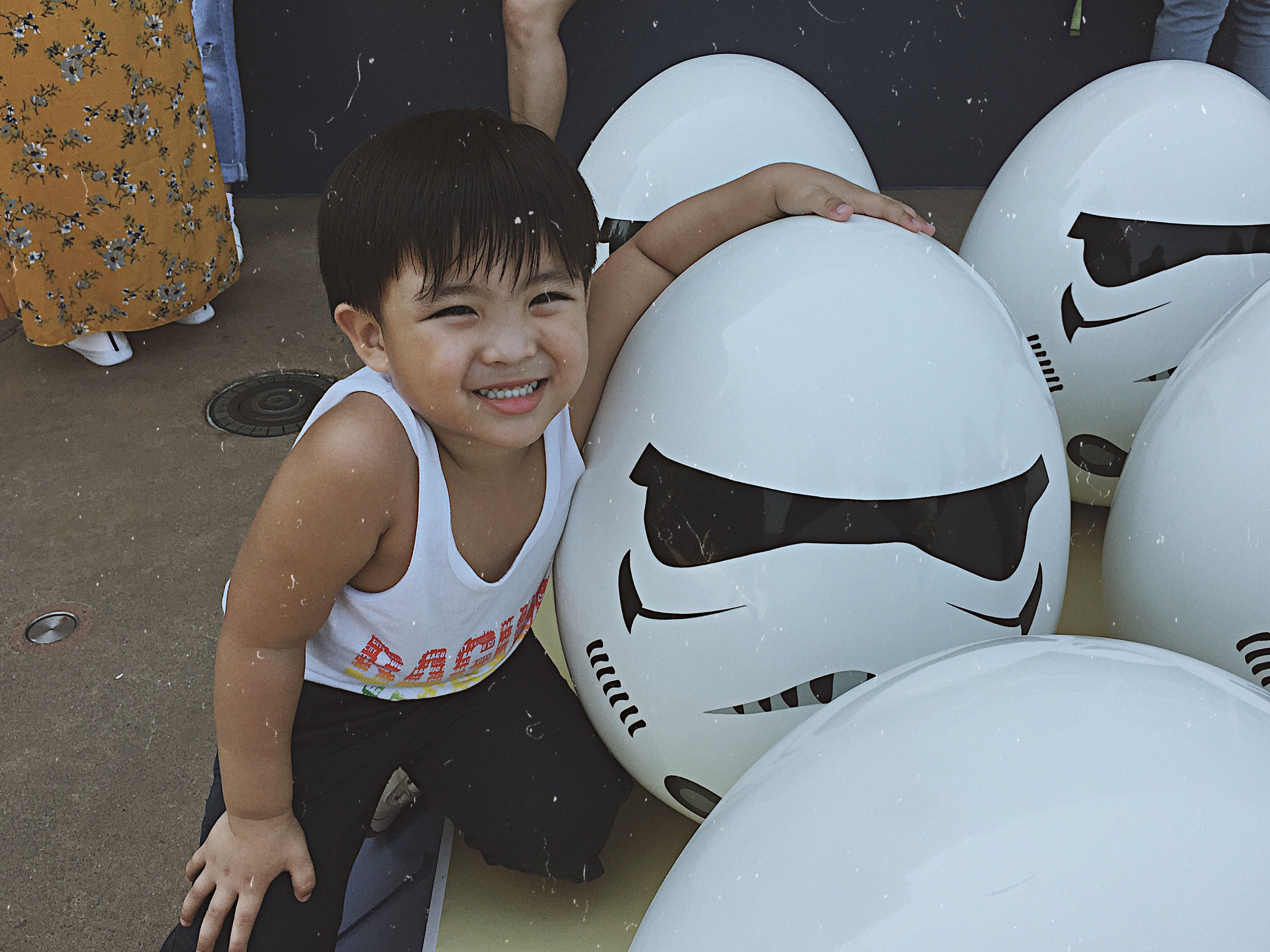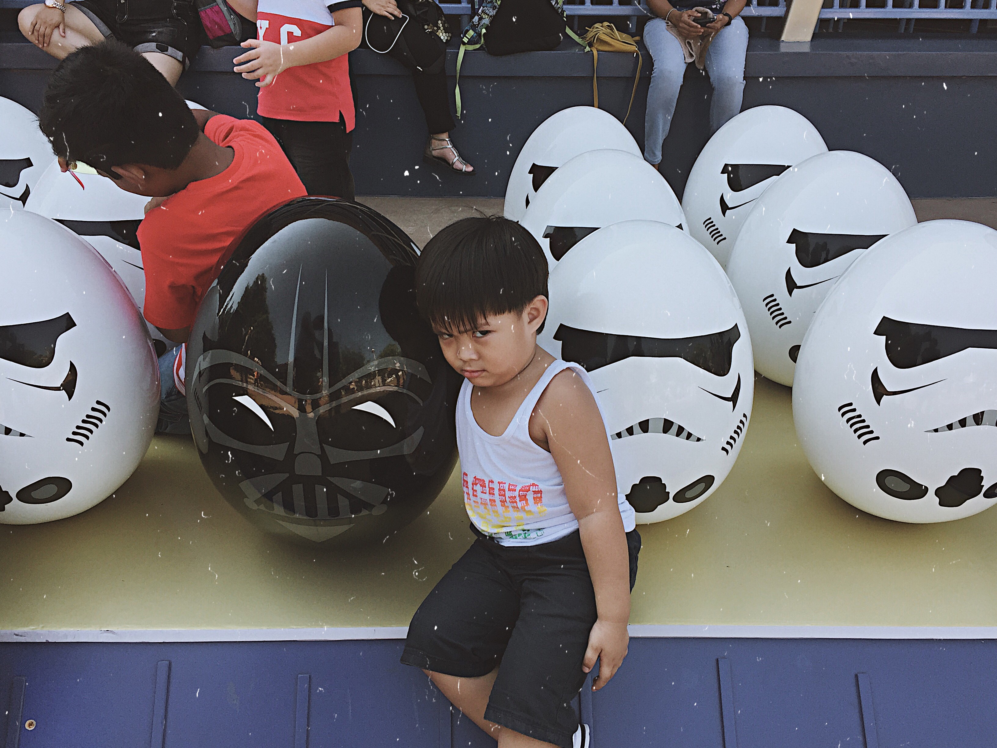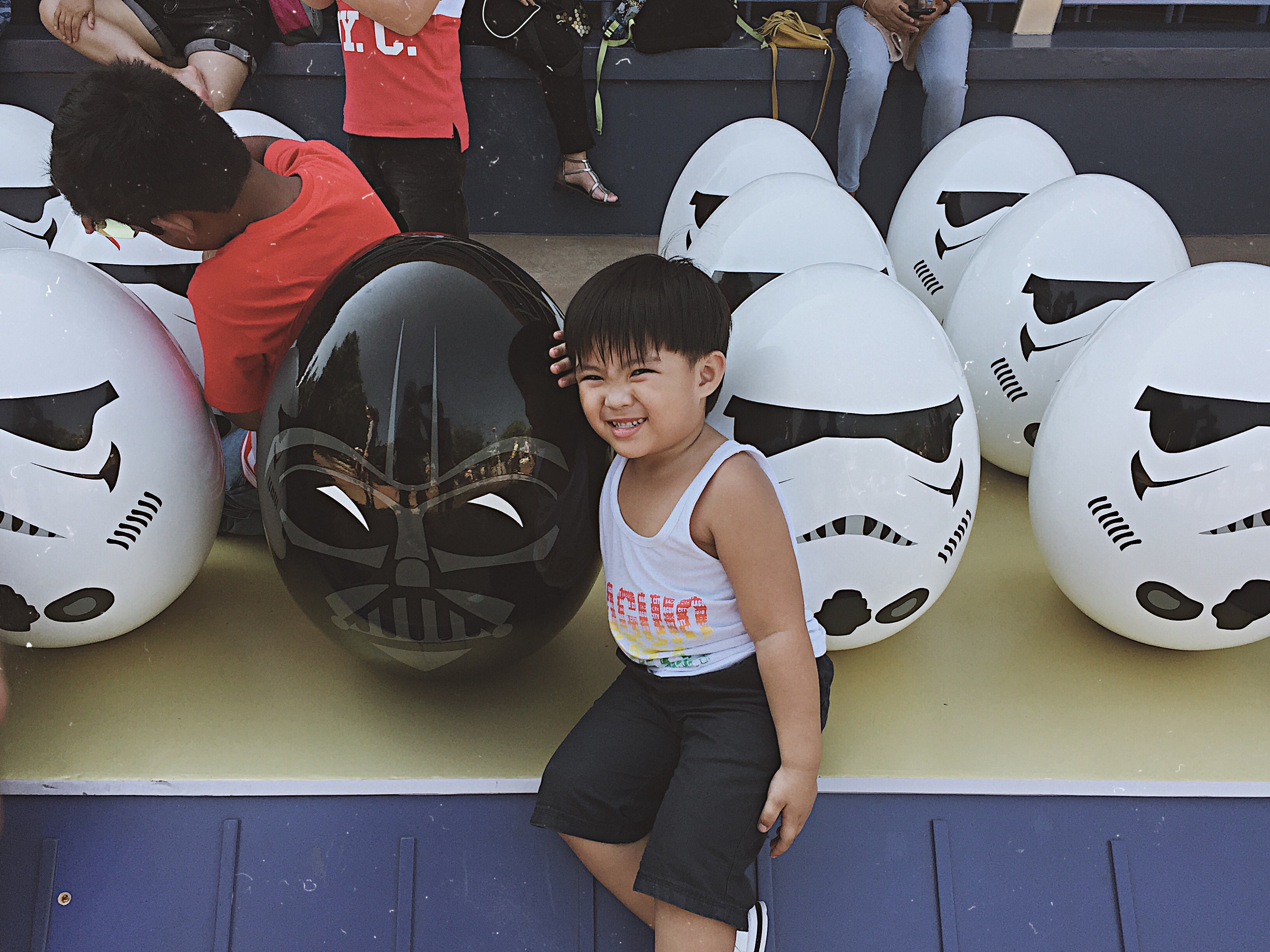 My baby bear is really fond of eggs, whatever that looks like an egg, he will pose and have his killer smile. We have found an egg at the Tomorrow Land.