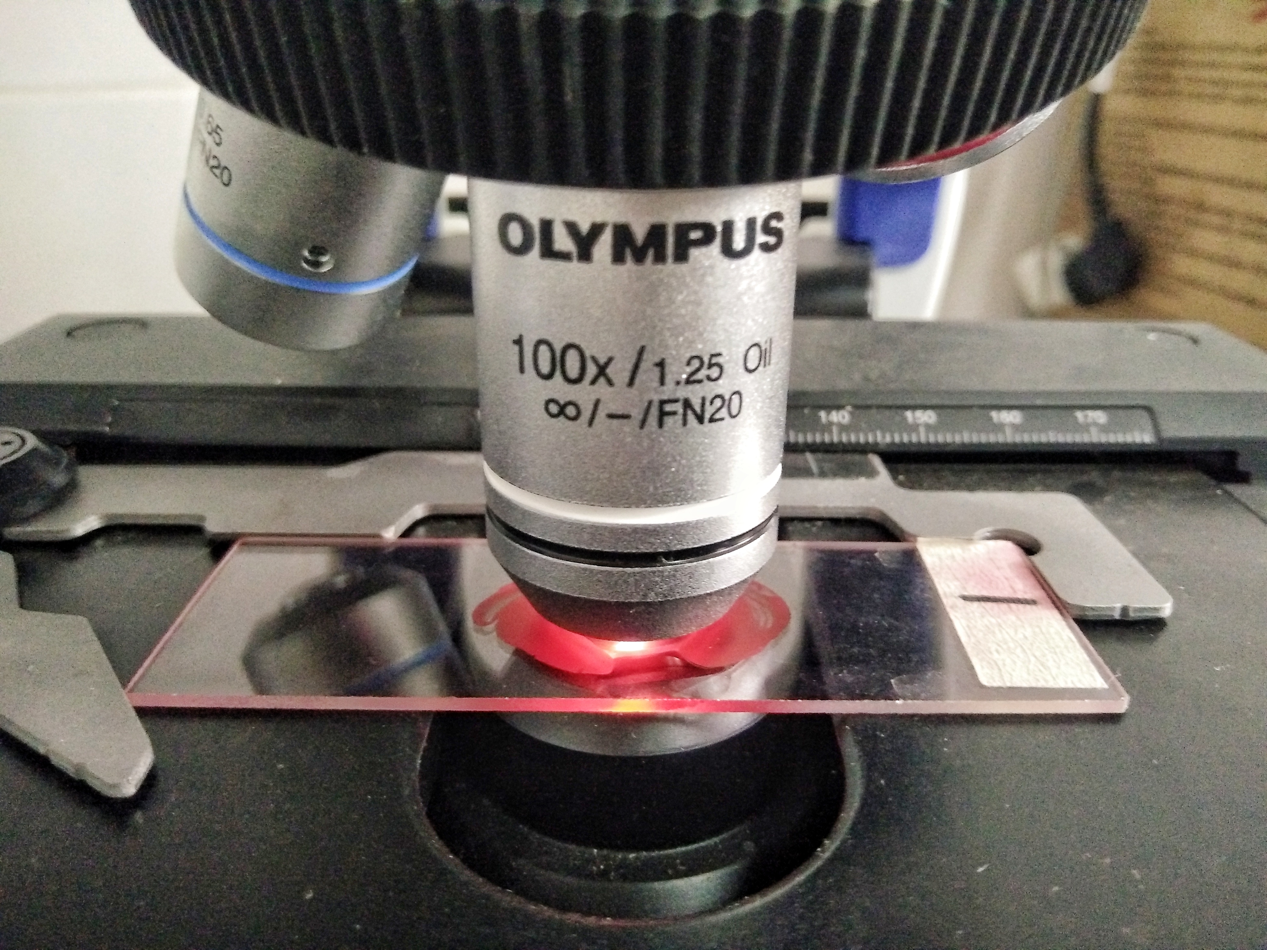 Place the slide on the stage of the microscope and tilt the objectives to Oil Immersion Objective.
