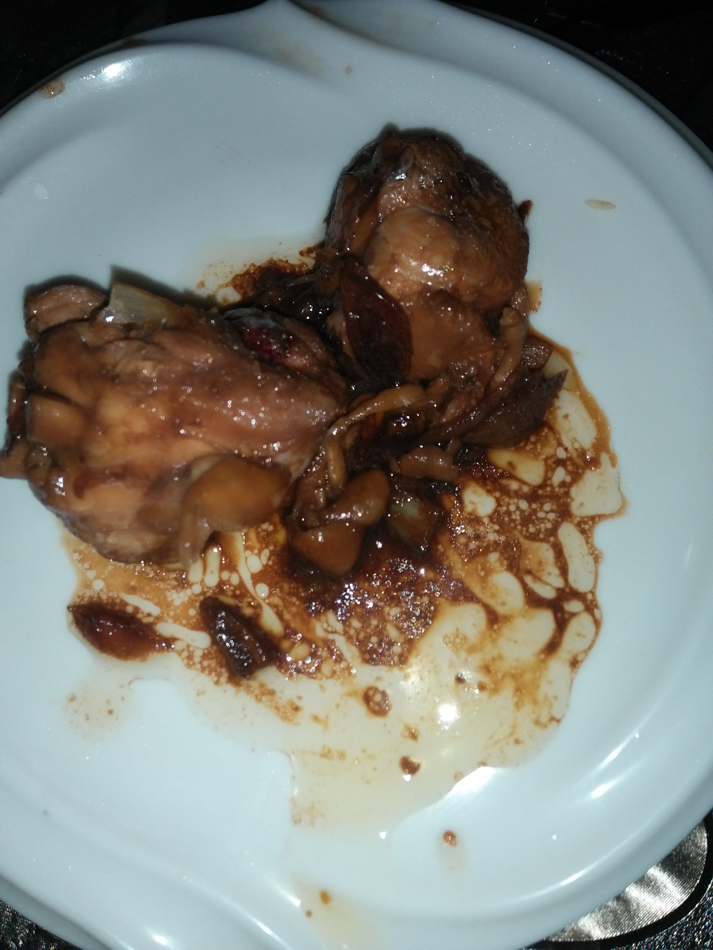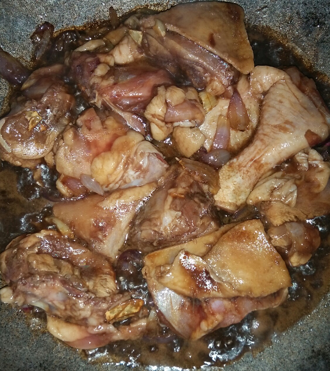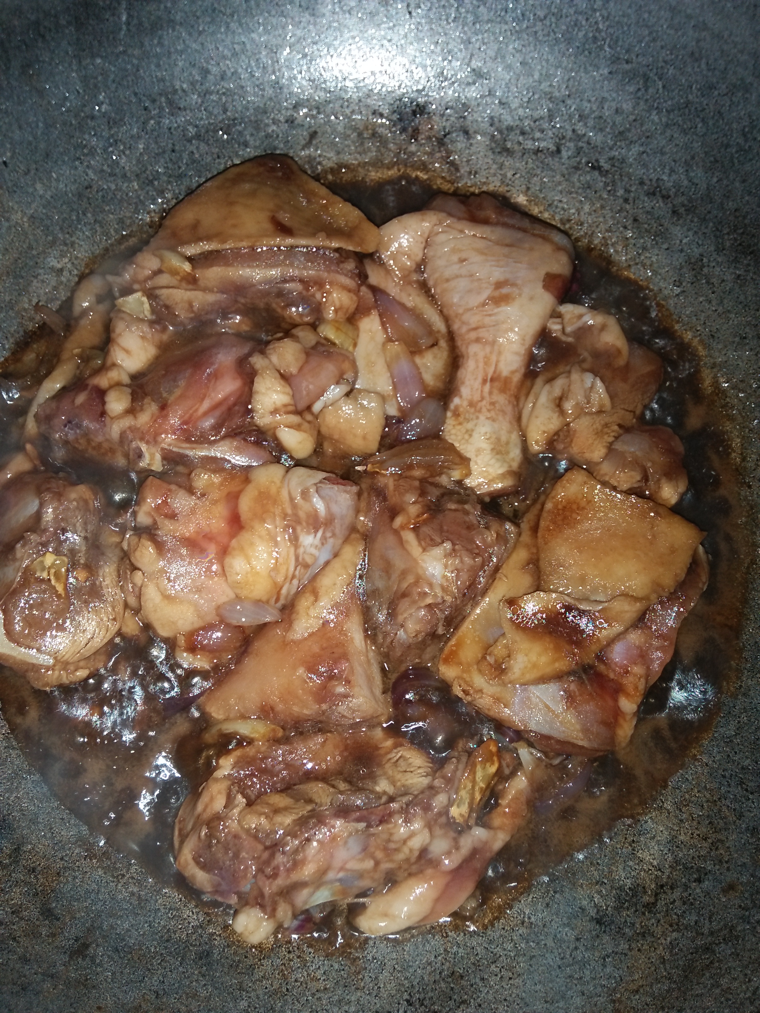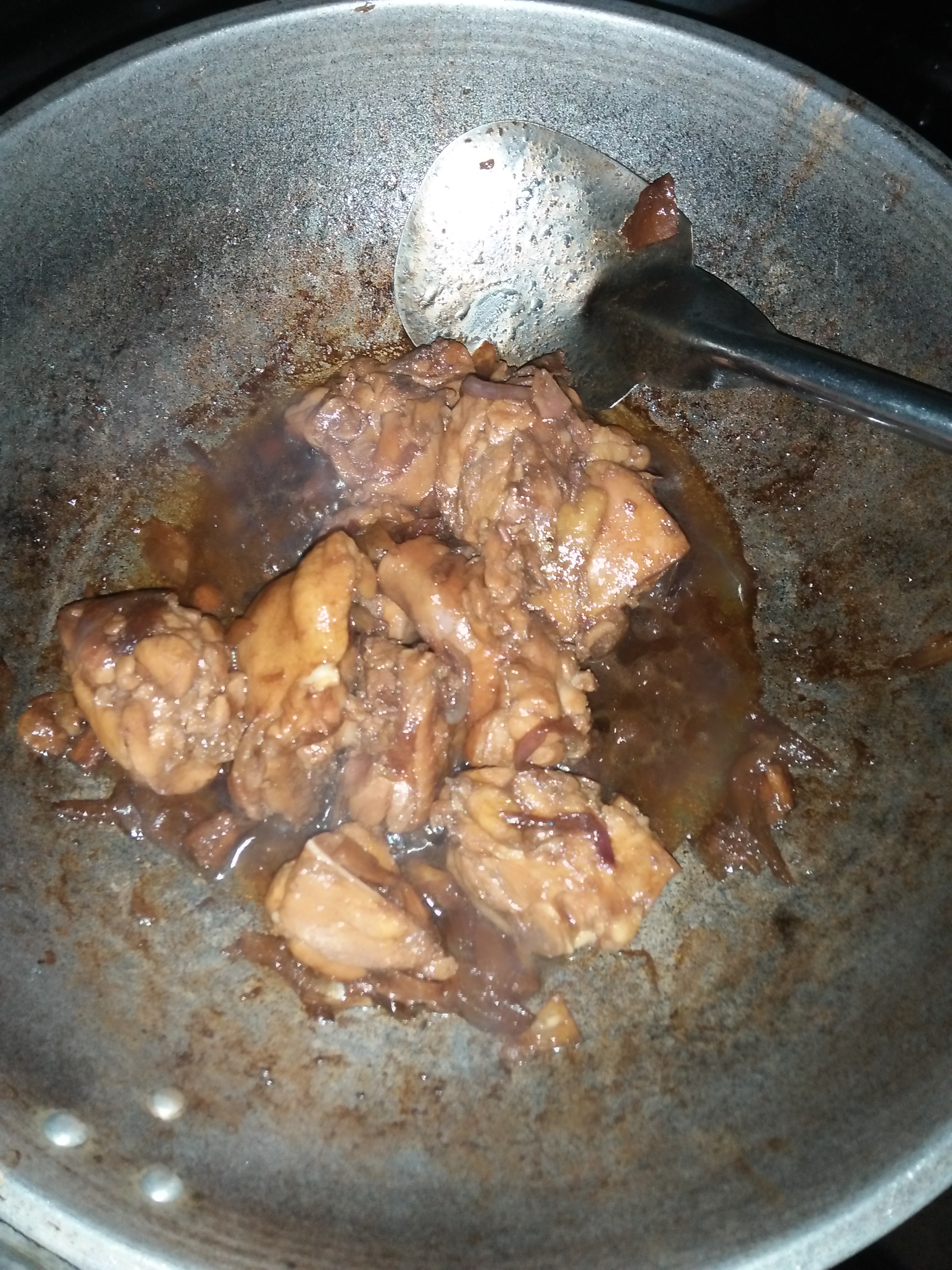I continue simmer the chicken until it is fully cooked and had released its oil into sauce and the sauce has thickened slightly and taken on a rich dark brown color.