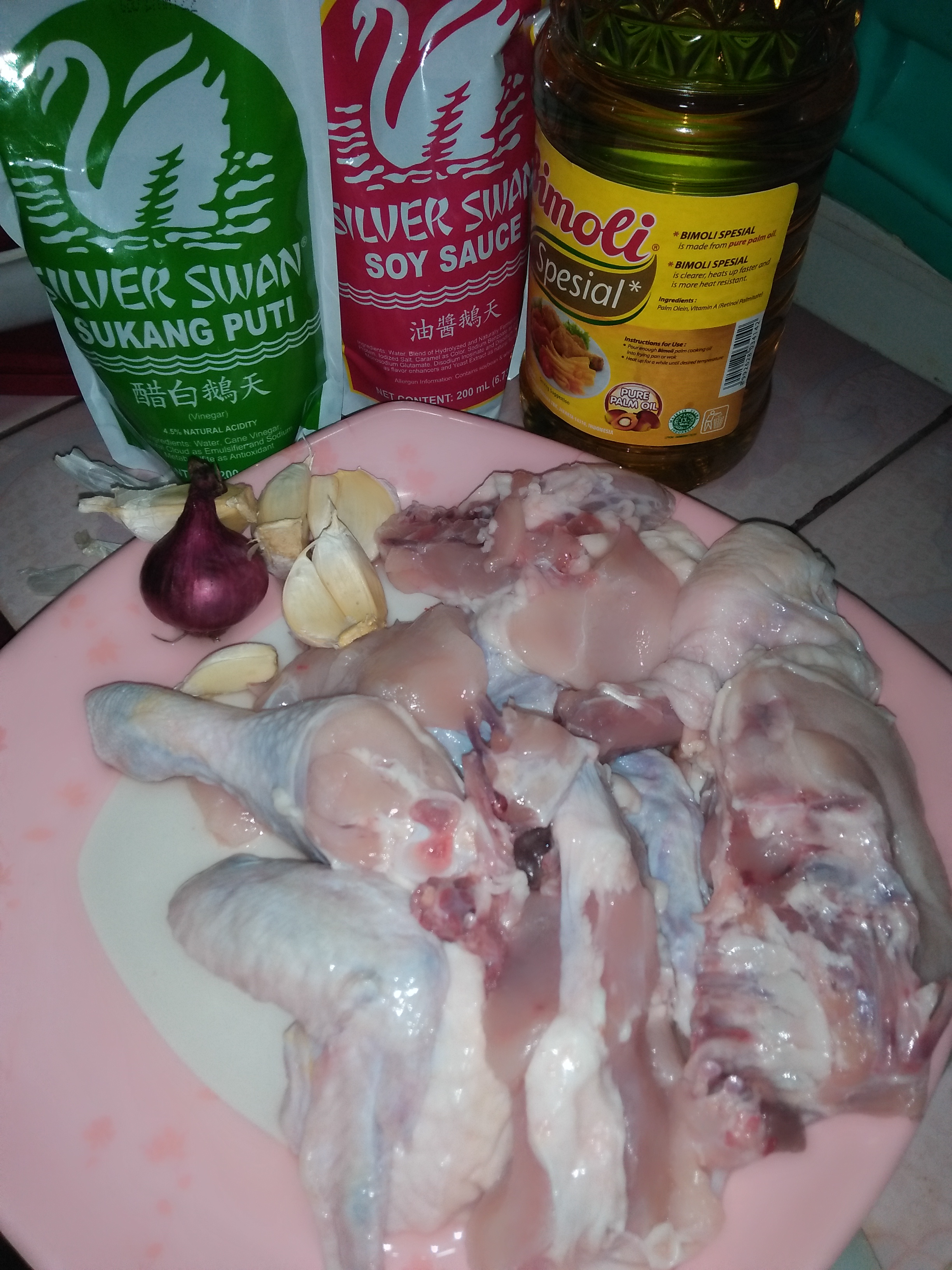 First step that I did is I prepare my simple ingredients,vinegar,soy sauce,garlic,and oil and of course the chicken itself and I wash the chicken carefully.