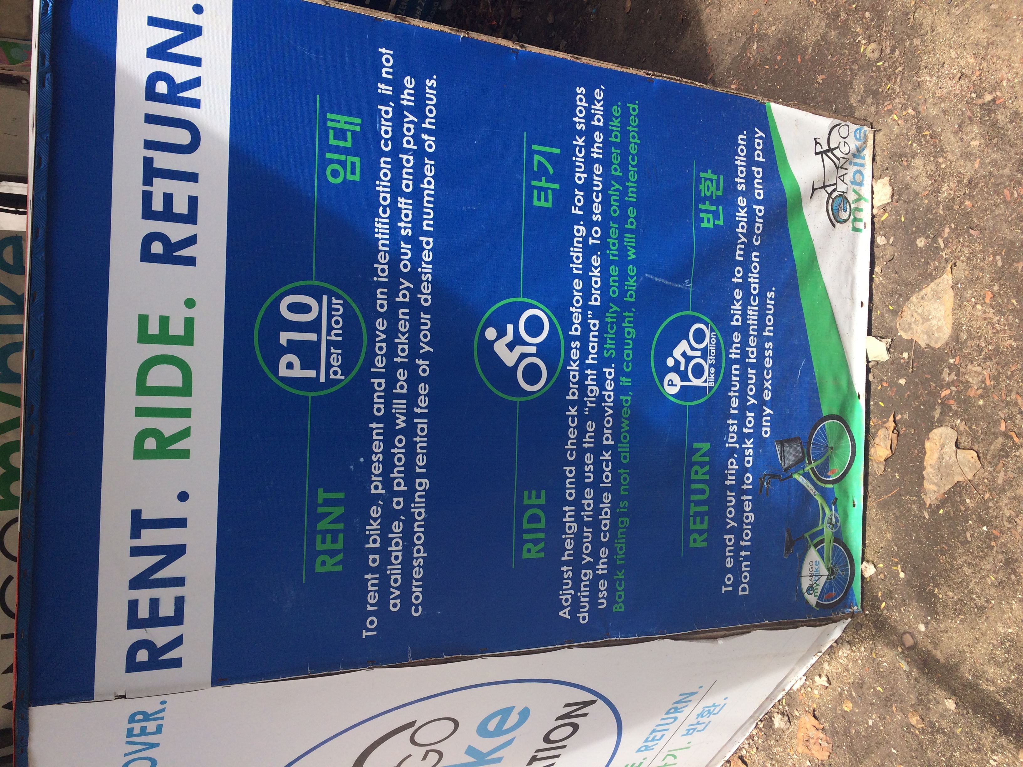 Olango mybike station offers 2 kinds of bike, the small and the big one. Bike rental varies, you can rent the small one for 15php per hour while 10php for the big ones.