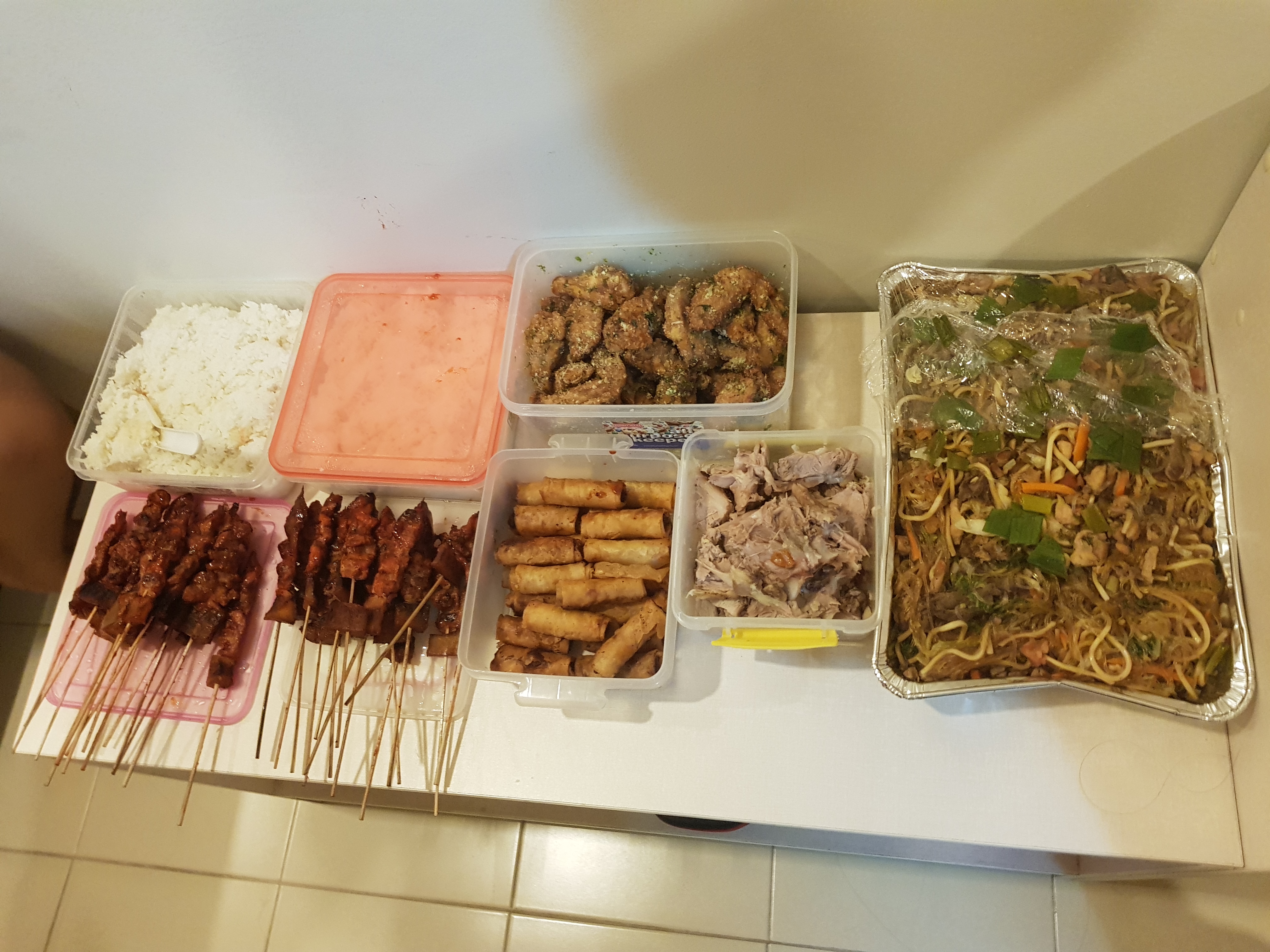 We had Pancit Bihon, Lechon Baboy , Garlic Parmesan chicken wings , Bbq , Lumpia.