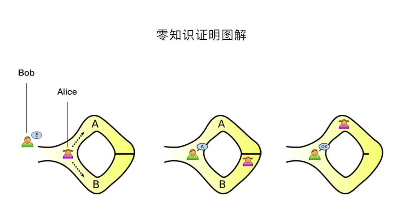 - This is a very classic example: there is a gaped circular corridor, the exit and entrance are very close (within eye distance), but somewhere in the middle of the corridor there is a door that can only be opened with a key. Alice wants to Bob proves that he has the key to the door. With zero-knowledge proof, Bob watches Alice enter the corridor from the entrance, and then walks out of the corridor from the exit. At this time, Bob doesn't get any information about the key, but he can prove that Alice owns the key.