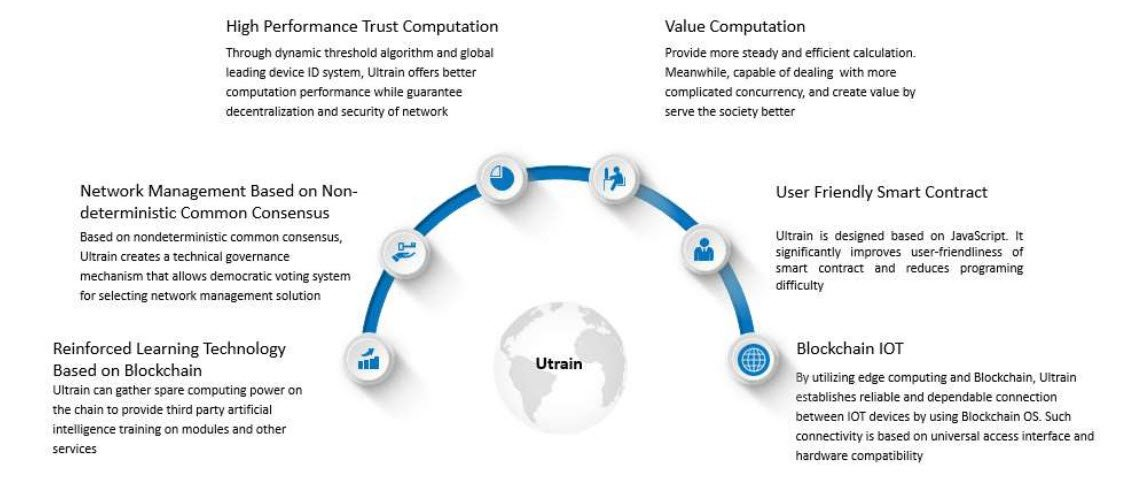Ultrain will provide “trusted computing”, a completely new model for providing calculation services based on the blockchain architecture. GPU computations are optimized to handle large groups of tasks and perform the same operation over and over, while CPU computations are perfectly tuned to process several program threads at a time; calculations using RAM (RAM), disk resource management and bandwidth capabilities can all be included in the framework of the software platform of this model. All of the above will take the characteristics of blockchain computations. They cannot be broken and they will be transparent and visible to all participants.