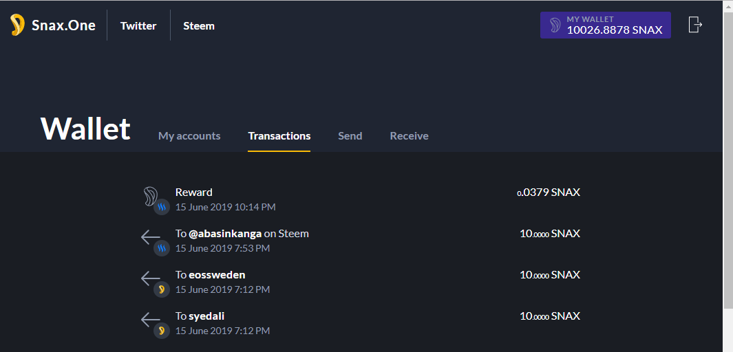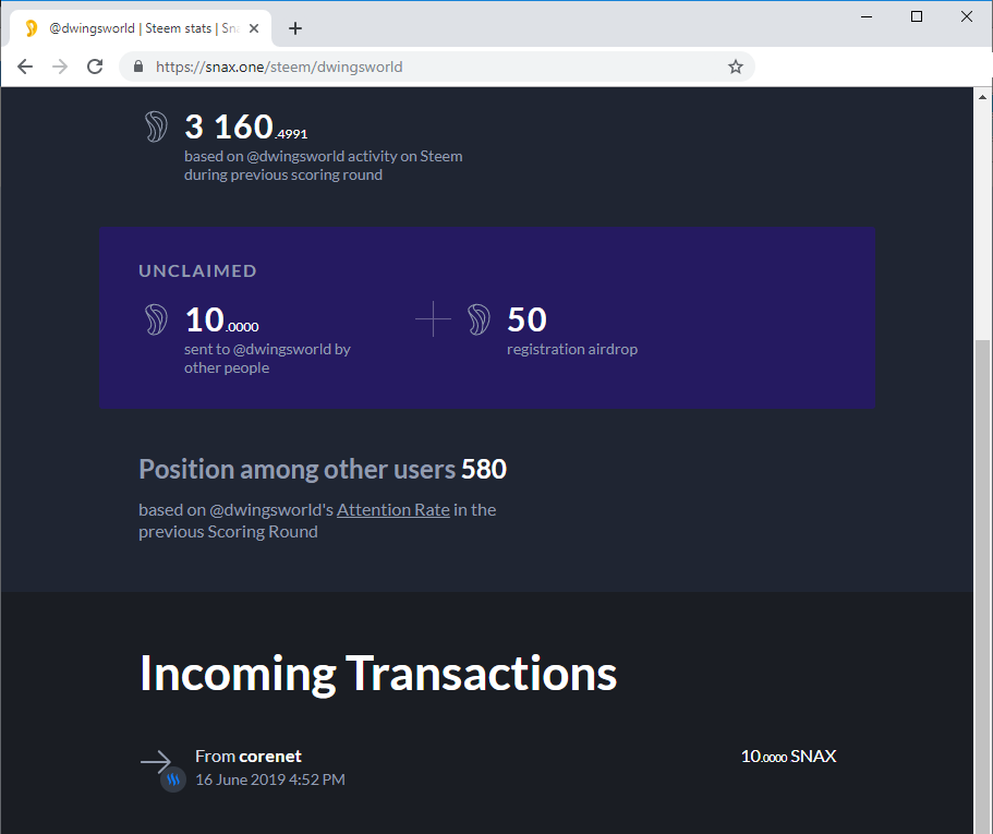 After you have completed the above 2 steps, you will be rewarded with 10 SNAX Tokens 💰 from steemit account @corenet to your steemit account. You will be able to monitor transactions live at