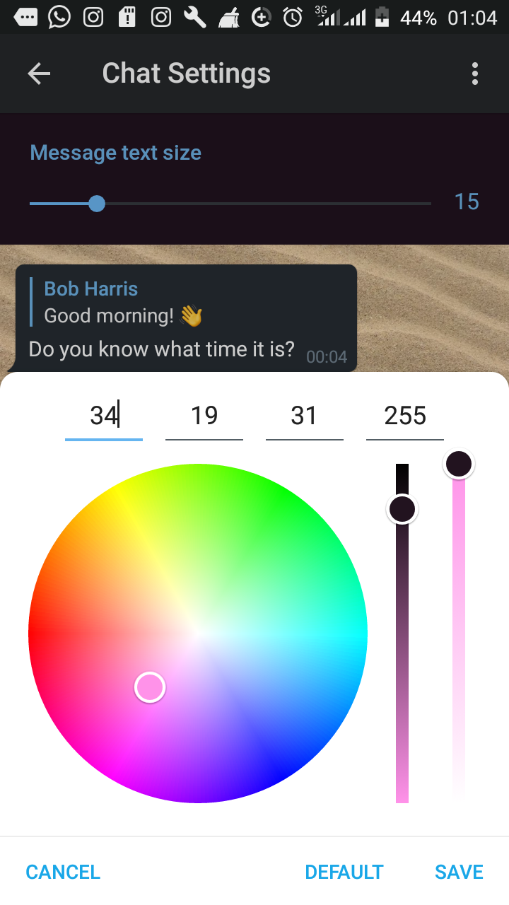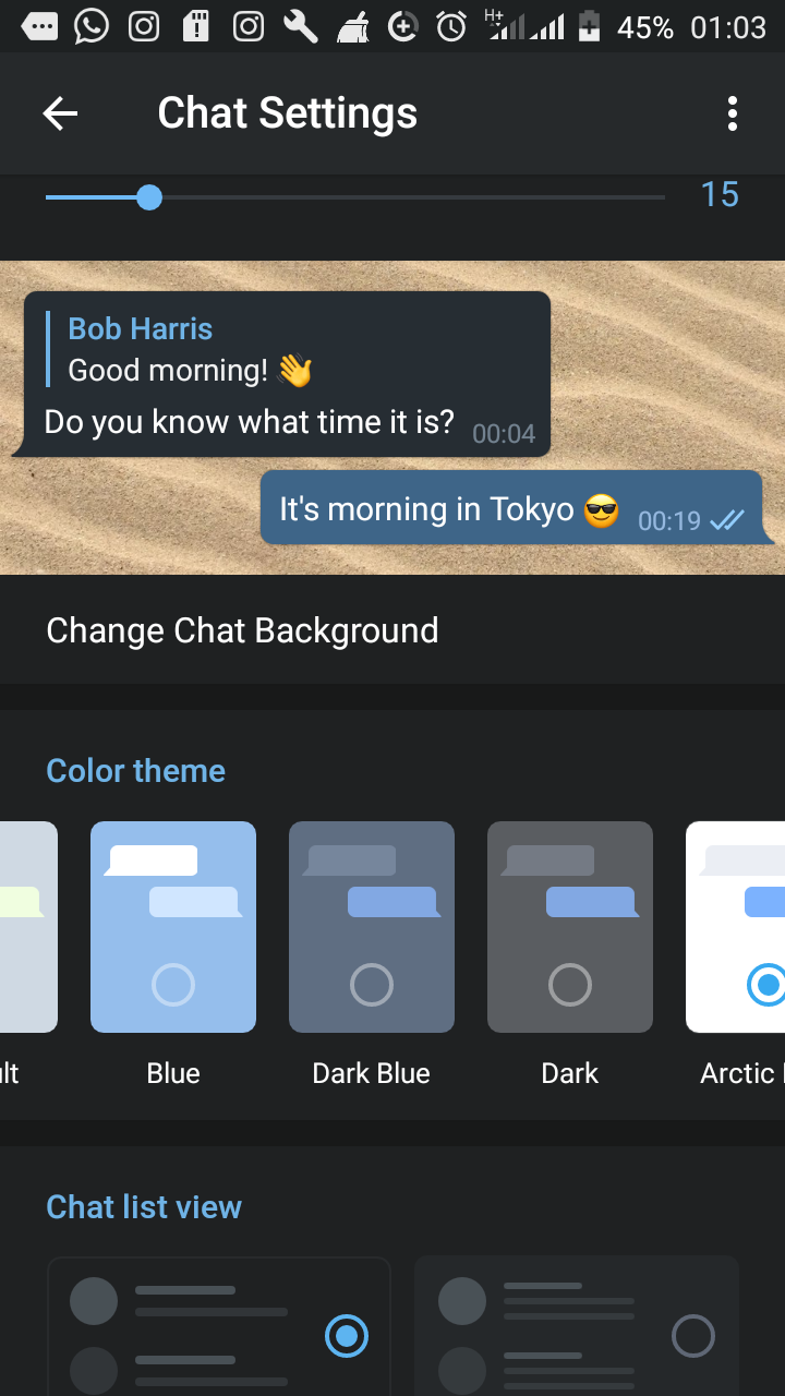 This is my favorite part of any app. It gives quite a personalized feeling whenever I craft the outlook of an app to my own design. Telegram helps me achieve personalized customization on so many levels. It doesn’t only have default theme options, but also the ability for one to create his/her own theme! How cool is that?