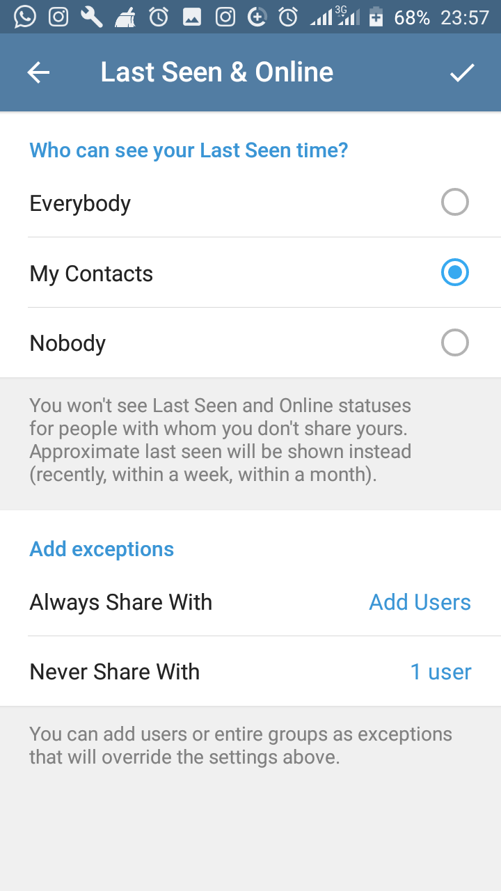 Not that I’m secretive, but I this feature is helpful in keeping one away from prying eyes. There are times when I’m busy on the app and don’t want any distractions by incoming chats from a special one, this feature helps with that. WhatsApp only allows one to hide last seen for everyone while telegram is very specific.
