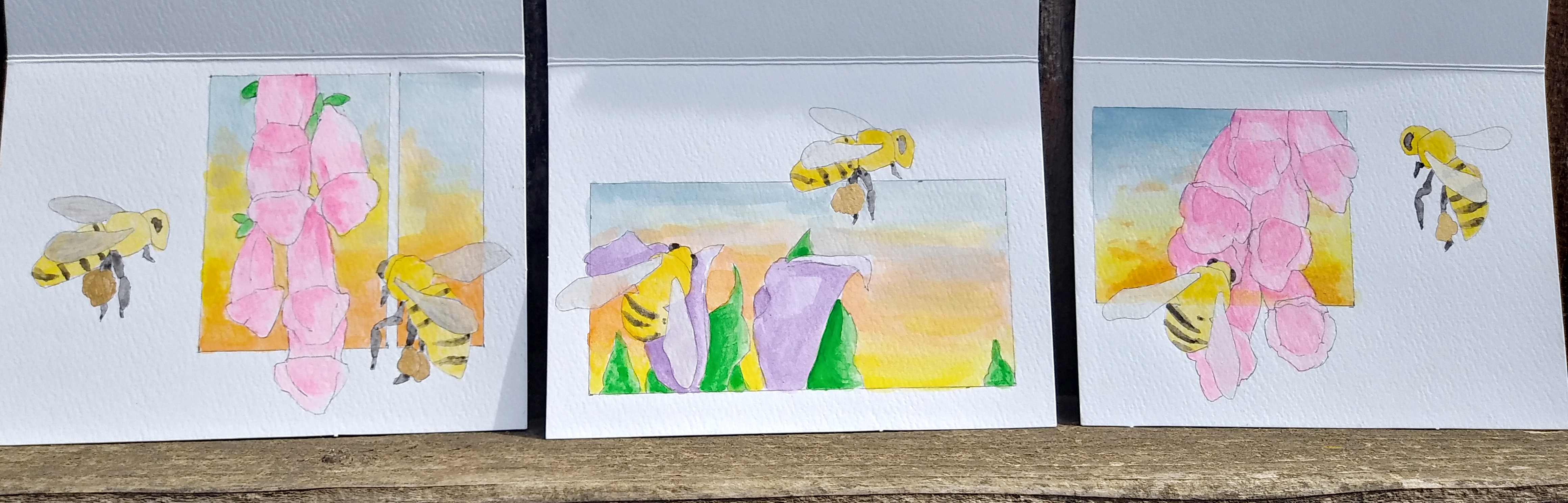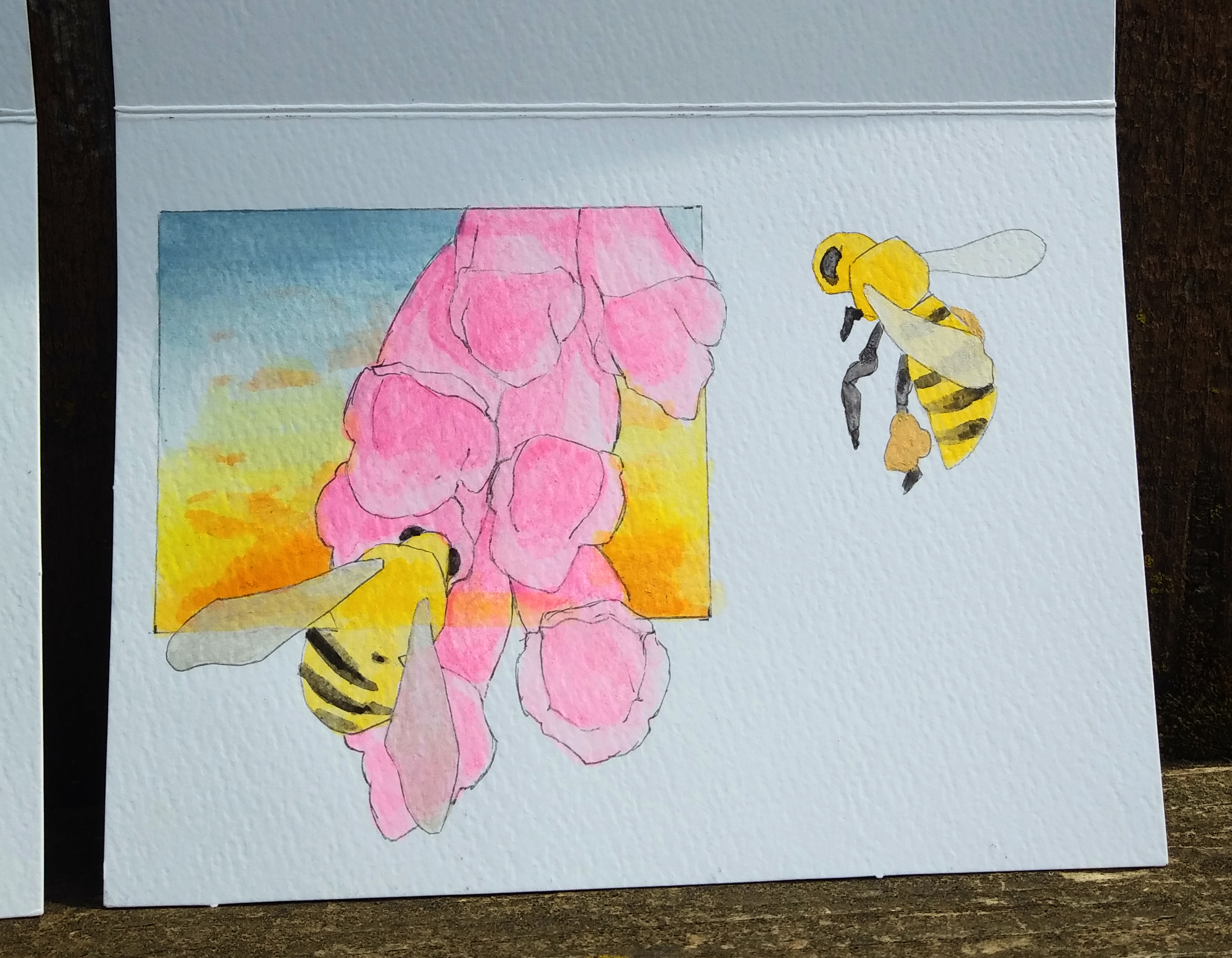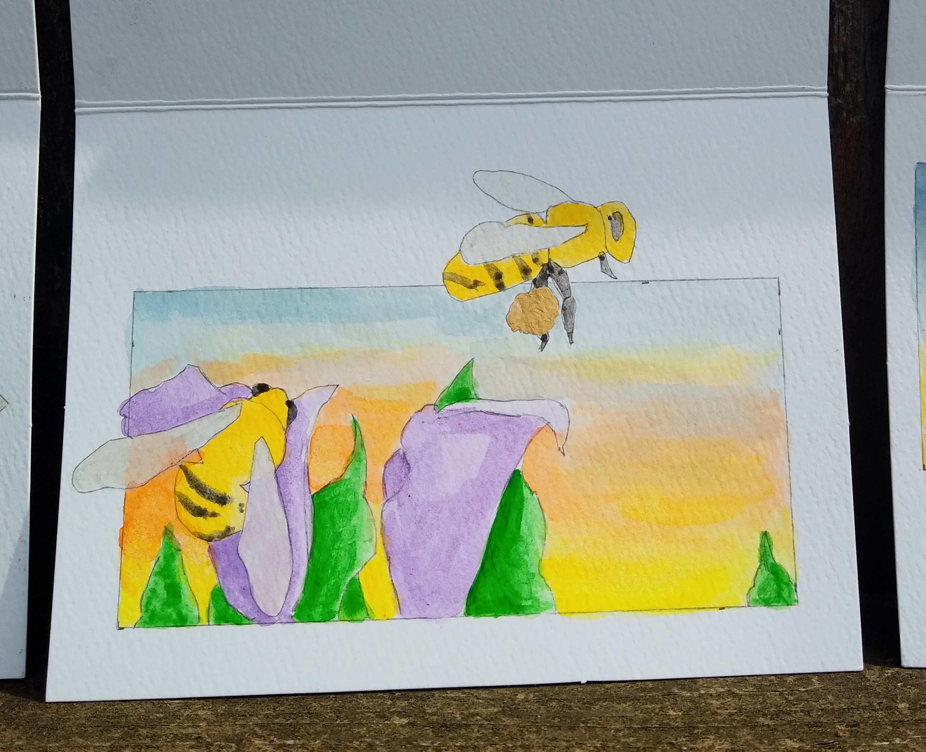 Got a bunch of blank watercolor greeting cards and decided to make a few for Mother's Day that is coming up next month. Been painting a lot of bee's and flowers lately so I thought that theme would work well for these as well. Just want something simple so I think i'm going to keep them blank and let someone write whatever they would like on the inside, make it a little more personal that way as well. As for the envelopes I was thinking of doing a black outline of one of the bees so it kind of ties the whole thing together, not quite sure yet will have to do a little test and see. These guys were done with watered down acrylic and an ink pen.