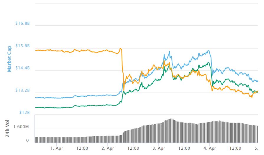 Ethereum (ETH) is holding onto its position as the largest altcoin by market cap, which is currently at about $17.7 billion. The second-largest altcoin, Ripple (XRP), has a market cap of about $15 billion by press time.