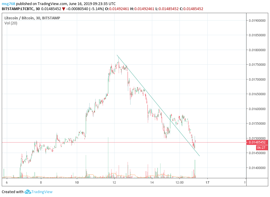 Litecoin has had a massive rally in 2019 and halving is going to take place in about six weeks. LTC/BTC however is the pair that I'm interested in. From its most recent top at 0.0177 BTC, it has dipped to as low as 0.0146 BTC today. But the chart I have above shows that it's already broken out of the short-term bearish momentum and it's now retouching and bouncing off the short-term bearish trend from the other side.
