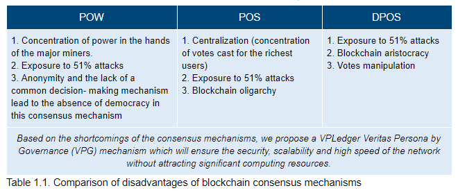 The majority of consensus mechanisms are vulnerable to 51% attacks, which is a serious disadvantage for any mechanism. This problem is not present in the VPG mechanism, as there are legal obligations of the authorized node to blockchain users.