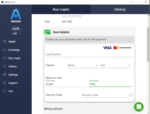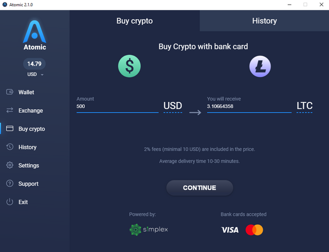 Atomic cüzdanınızdaki Buy Crypto sekmesini kullanarak almak istediğiniz litecoin için harcamayı düşündüğünüz usd doları girdiğinizde sizi kredi kartı bilgilerinizi gireceğiniz ekrana yönlendirilirsiniz. Uygulama Avrupa Birliği güvencesiyle çalışan Simplex’in sunduğu bu hizmet ile sadece atomic walletinizi ilk kez kullandığınızda sizden istediği KYC ve Fatura adres bilgilerinizi verdikten sonra al butonuna basarsanız litecoinleriniz sizin olur. Herhangi bir internet bankacılığı işleminden hiç farkı olmayan bir işlem düzeniyle Litecoin alabilirsiniz.