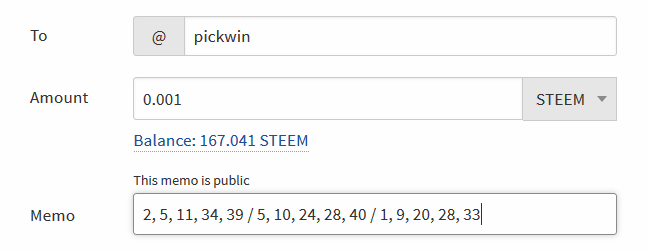 Pick your lucky numbers and send a transfer with 0.001 STEEM. In the transaction memo enter a three sets of your numbers.