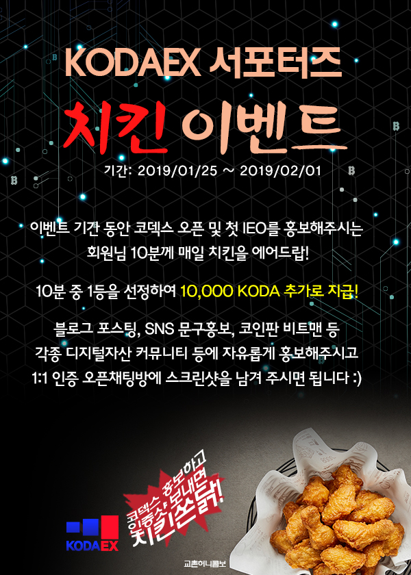 1월 25일부터 2월 1일까지 8일간 KODAEX 오픈 및 첫 IEO를 홍보해주시는 회원님 10분을 선정하여 교촌 허니콤보치킨 기프티콘을 드립니다.