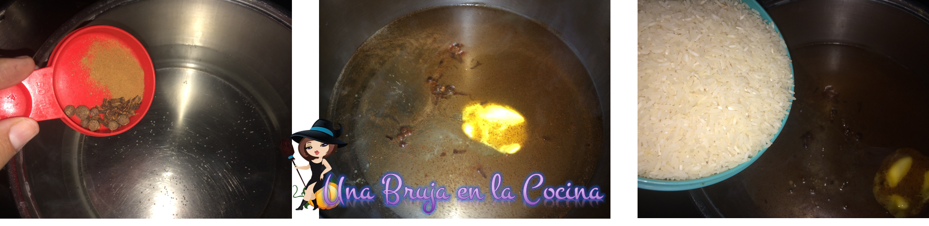 En una olla grande colocamos el agua y llevamos al fuego, agregamos las especias dulces (canela, clavo y pimienta inglesa) y la mantequilla, para continuar agregando el arroz.