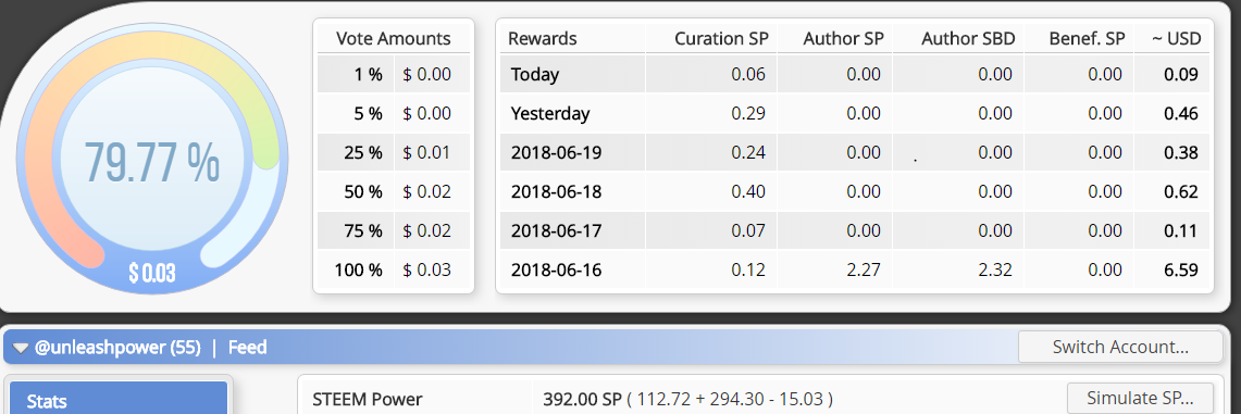 This was a brutal week as the bottom simply fell out. First the price of steem dropped (along with sbds), but finally now the internal price has caught up so we can average in at the lower prices. We we basically just stuck all week long doing not much of anything.... The price of steem dropped again from a 2.68 value to 1.65 value in the last week. Even with all that negativity, we are still holding in there. Our balance of sbds increaded to $28 (+5), but our upvotes in the hopper dropped down to 49 (-$15) (see chart below). So we had a small loss as we essentially lost $15 worth of votes and but gained $5 sbd (note we did pick up some steem power, but that isn't what we mark ourselves against). The good thing is the market dropped from a bit over $2.68 for steem and now it is being priced in the mid $1s, thus we have handled the drop rather well. With the new system on steemworld, we can now see what is exactly in the hopper, so now we have about a net $53 sbds once the posts pay off, so that is essentially down $1 sbds from last week.