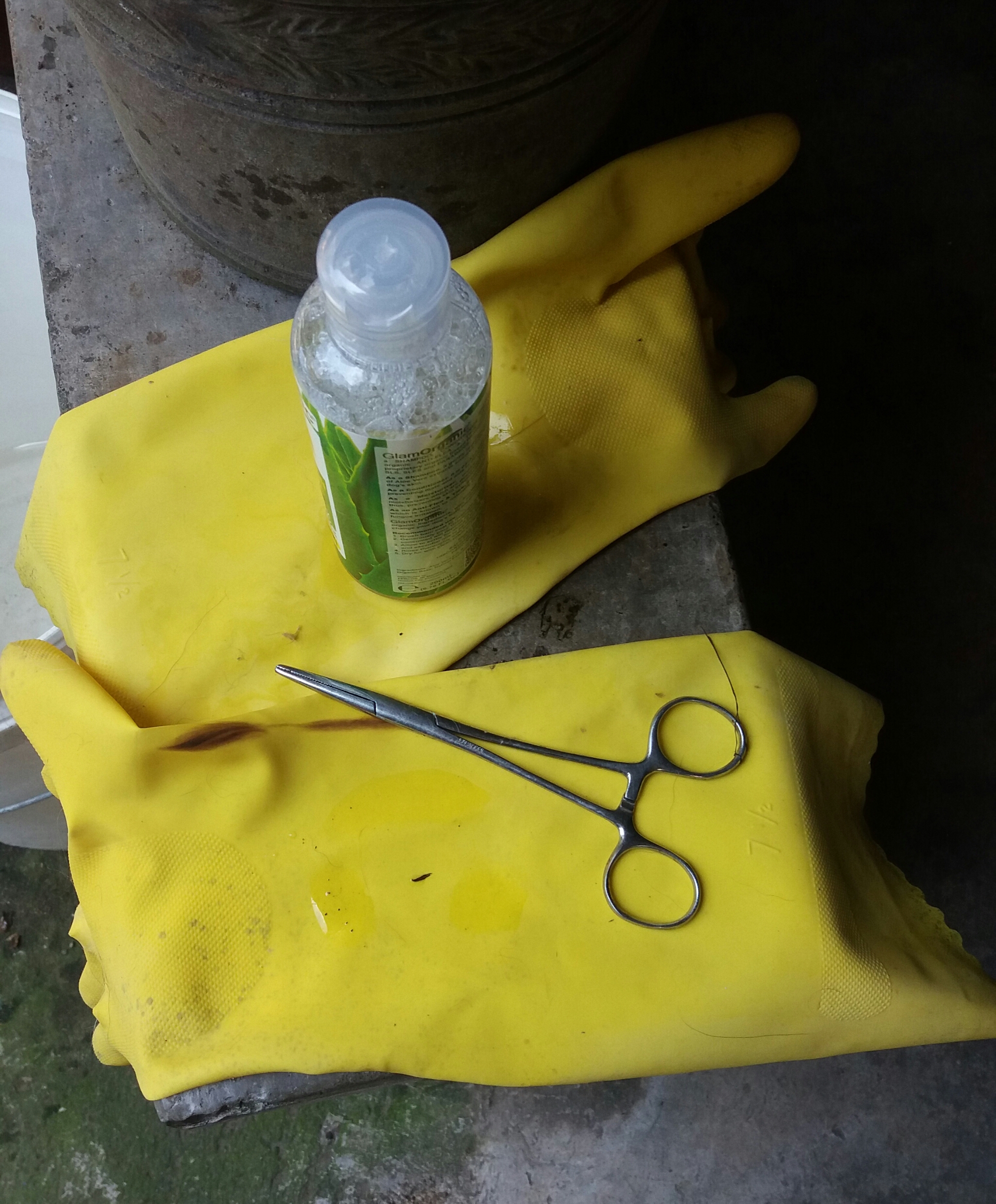 Second, I removed her most visible tick and fleas with gloves on, using forceps to avoid plucking surrounding fur.