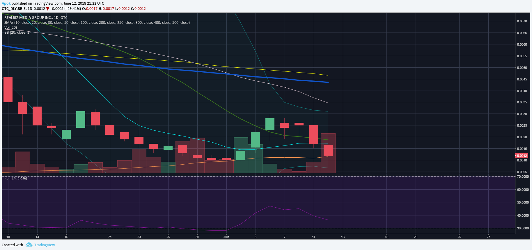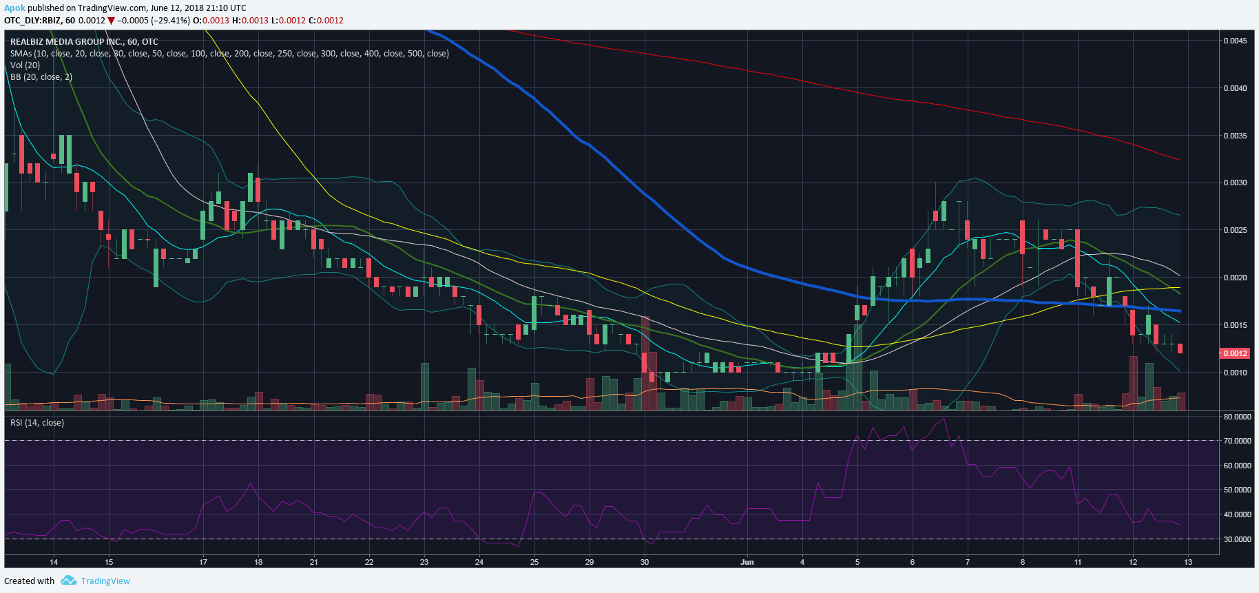A few things we like here... all key moving averages, on the hourly, have been hit except the 200. The red line. The lower bollinger band indicates the price is low, and the RSI indicates oversold, once again. Anticipation of a bounce and move up to the red line to close our trade as long as the volume persists.