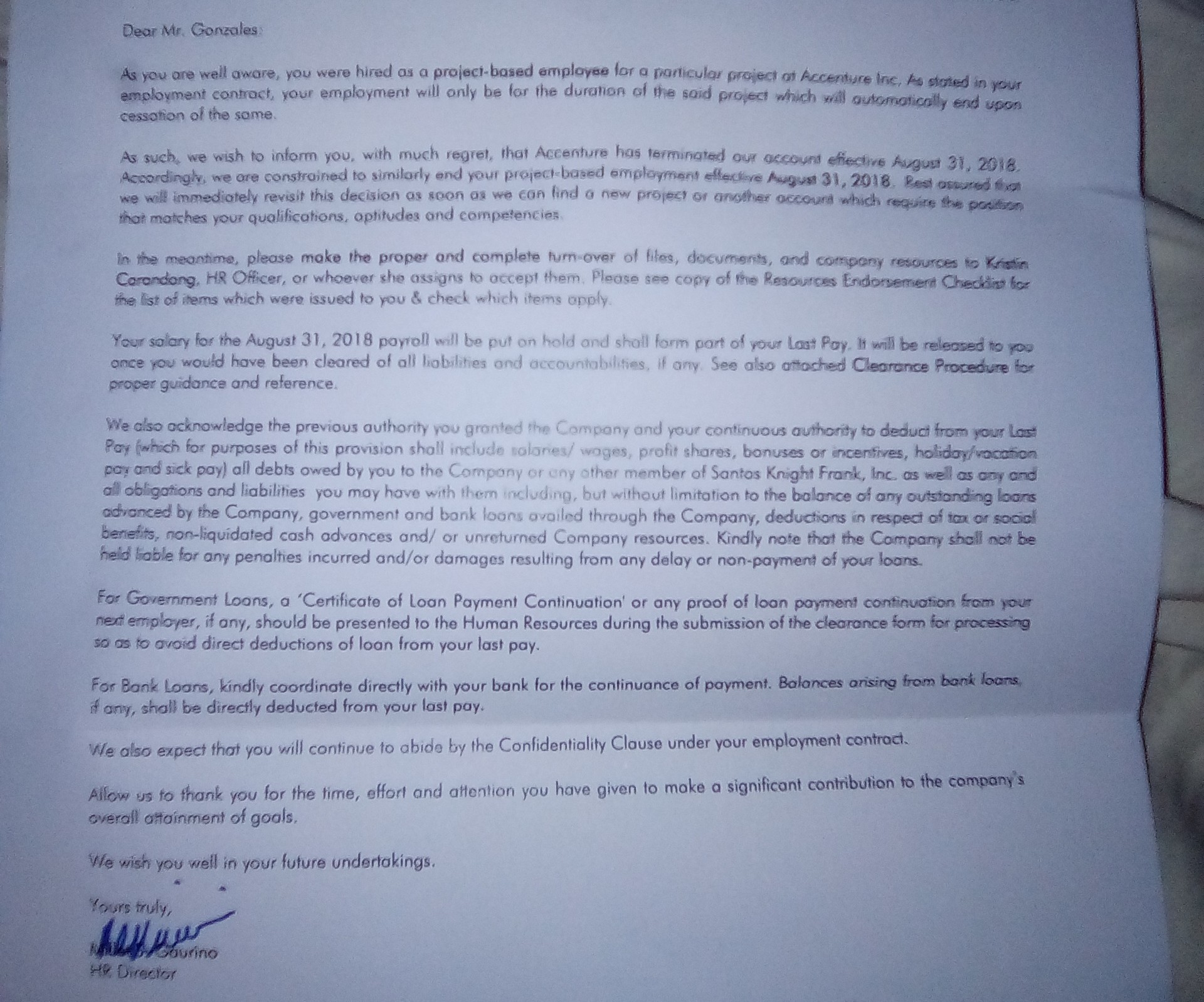 Today we had a meeting together with our company, they announce that this coming August 31 our company was terminated by our client , they did not win the bid.