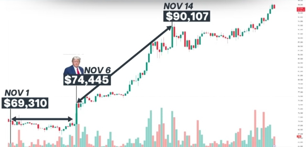 It was at $68,000 on election night, it Rose to almost $75,000 when Trump won and now it's inching towards $100,000 all because of sentiment. Trump has not taken charge yet but indications are that he will be a crypto-friendly president, that he will reduce regulations on crypto. We saw that first on the campaign trail he promised to turn the us into the world's crypto capital.