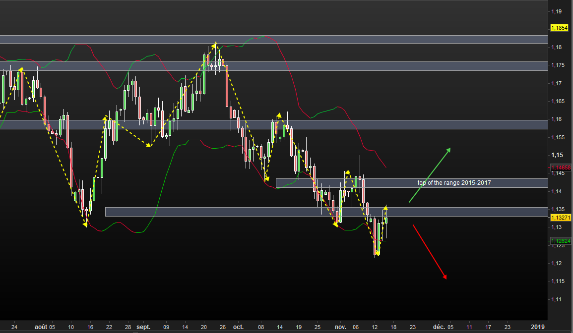 Tendance baissière en milieu de cycle impulsif. Réintégration d'un précédent range entre 1.14 et 1.05 au long de la période 2015- mi 2017