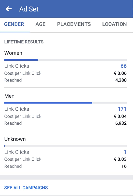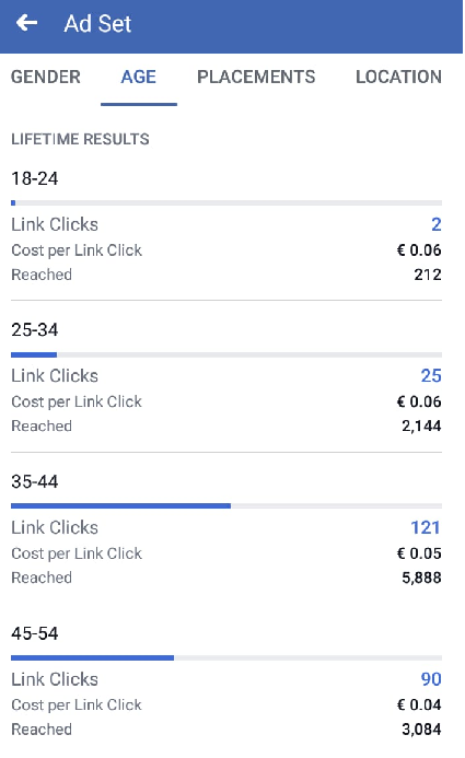 After analyzing the partial results throughout the duration of the campaign, it was possible to see how people reacted to advertising regarding their age and gender, which is why the age range was reduced to people between 34 - 54 years, and show advertising only to men, so that the ad would be shown to people who were more likely to be willing to enter the Moodle website. The following data are the final results but with this it is possible to notice the previously stated: