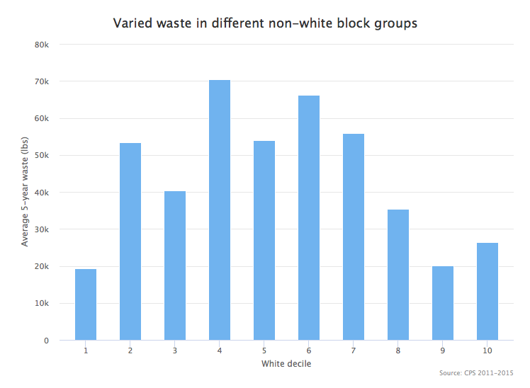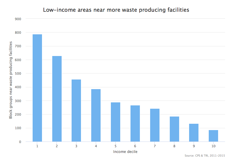 There is a similar trend with income, as waste-producing facilities are more likely to be in poorer areas.
