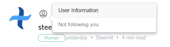 Few weeks ago, we decided to add to Steemit a popup in the post page showing for every user if they are following you, voted for you as a witness or using you as a proxy. This feature has been asked by a few Steemian because it's an easy way to see if a user is one of your follower without going to his page. We ve now made it available on Busy