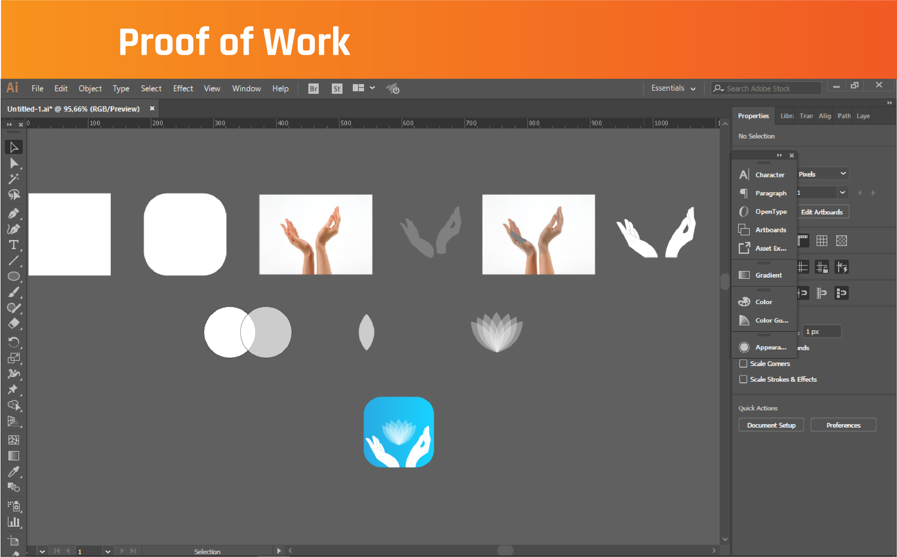 I made a few icons on the Project Owner addressing the health field. I combined a plus sign and a heart and a notebook. However, the project owner wanted a completely different concept. Thus, healers showed an example for concept. So I created a logo that includes hand and lotus flowers according to this concept. In this way,