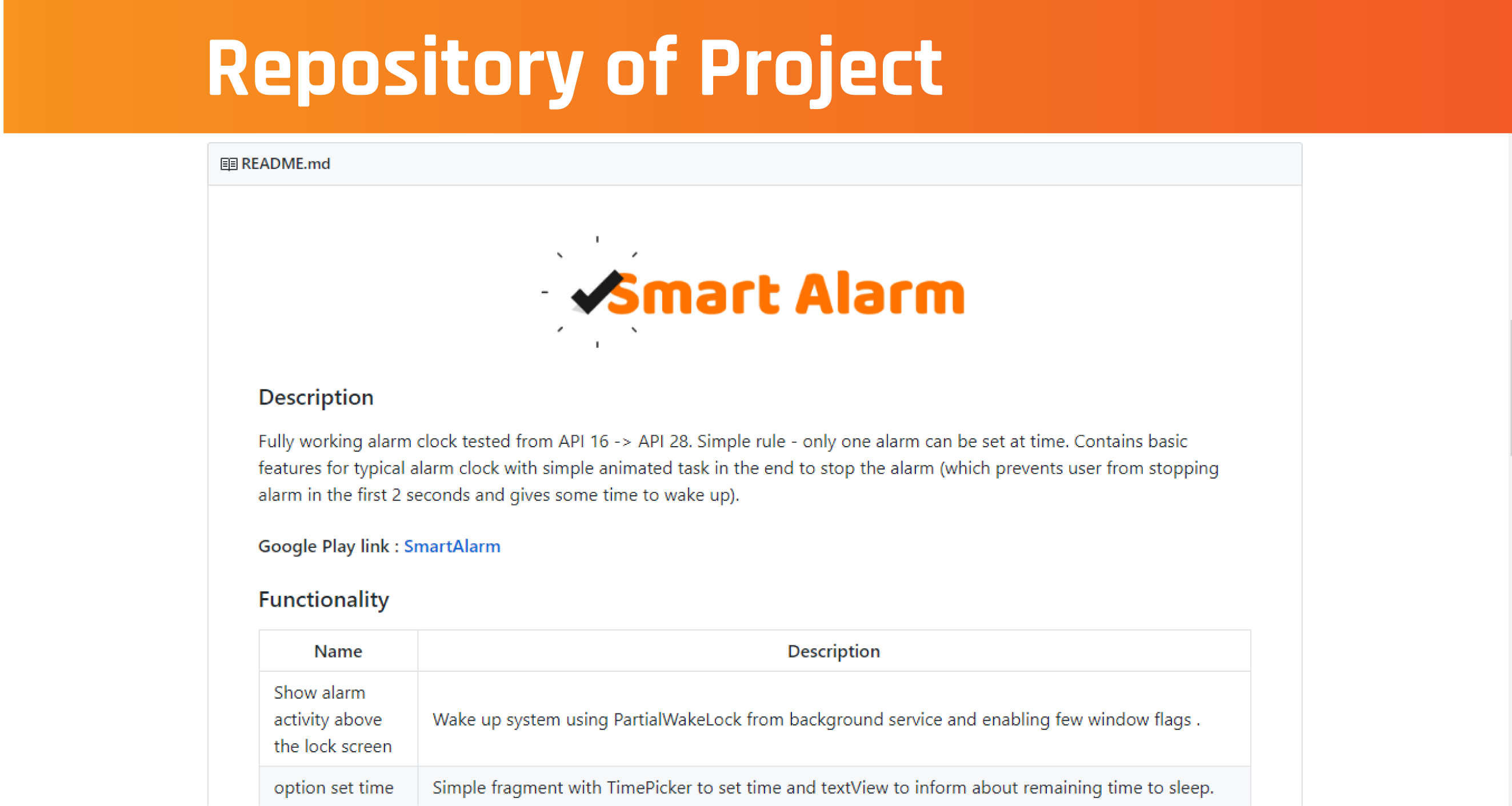 Fully working alarm clock tested from API 16 -> API 28. Simple rule - only one alarm can be set at time. Contains basic features for typical alarm clock with simple animated task in the end to stop the alarm (which prevents user from stopping alarm in the first 2 seconds and gives some time to wake up).